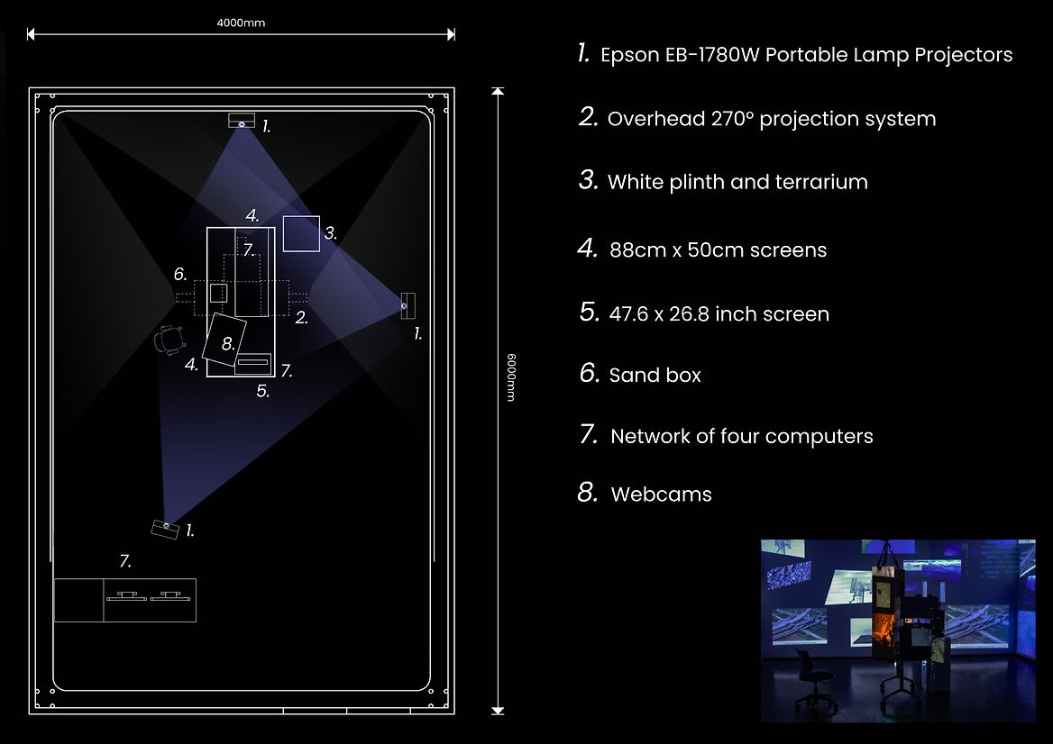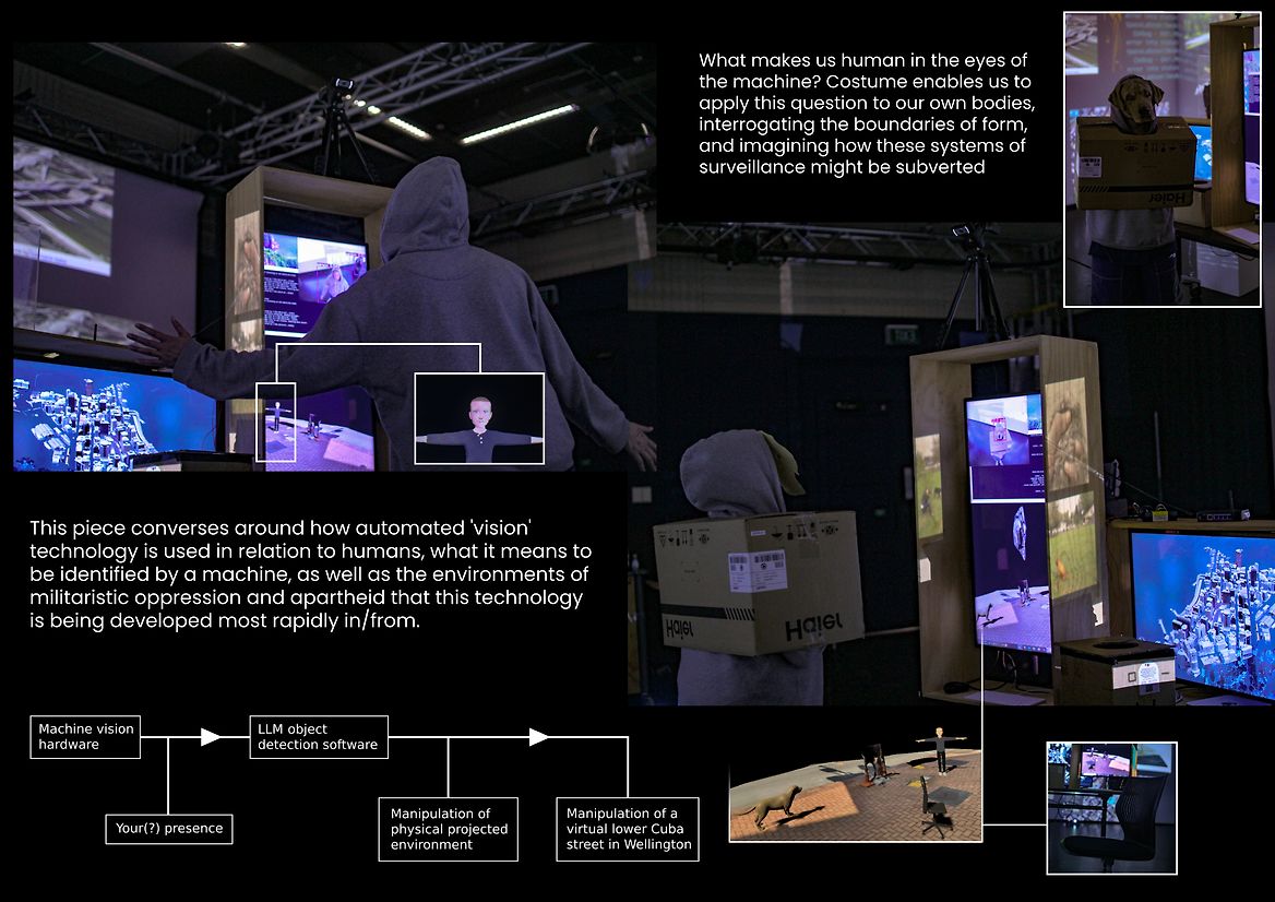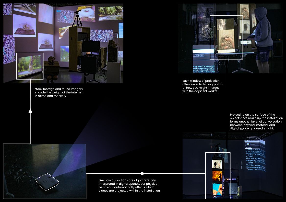 The interactions are programmed to modify a connected digital landscape of images and videos, using humour and juxtaposition to highlight the link between human action, a rapidly digitising world, and the ideological backgrounds of determinism, militarism, extractivism, and colonialism at the roots of our technological development.