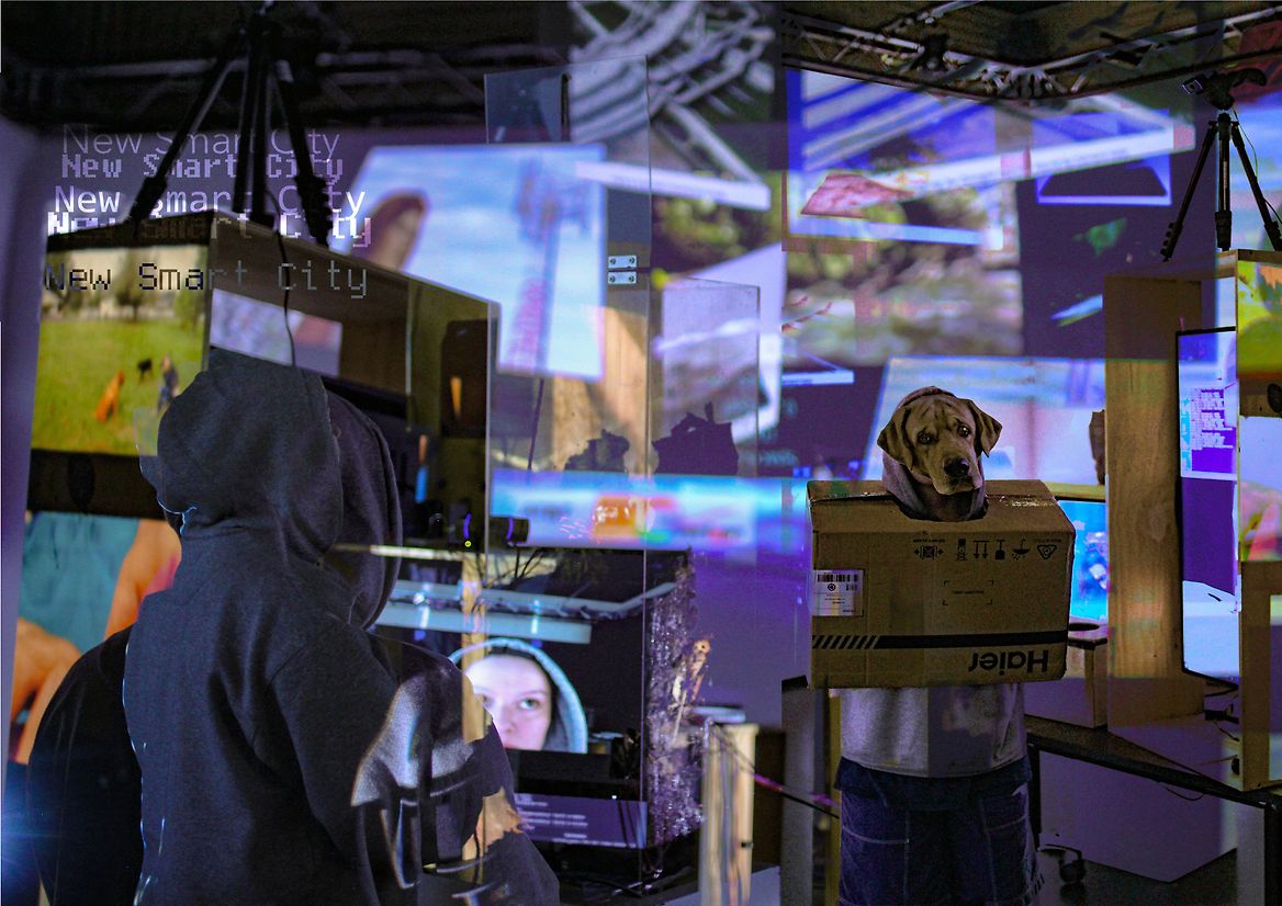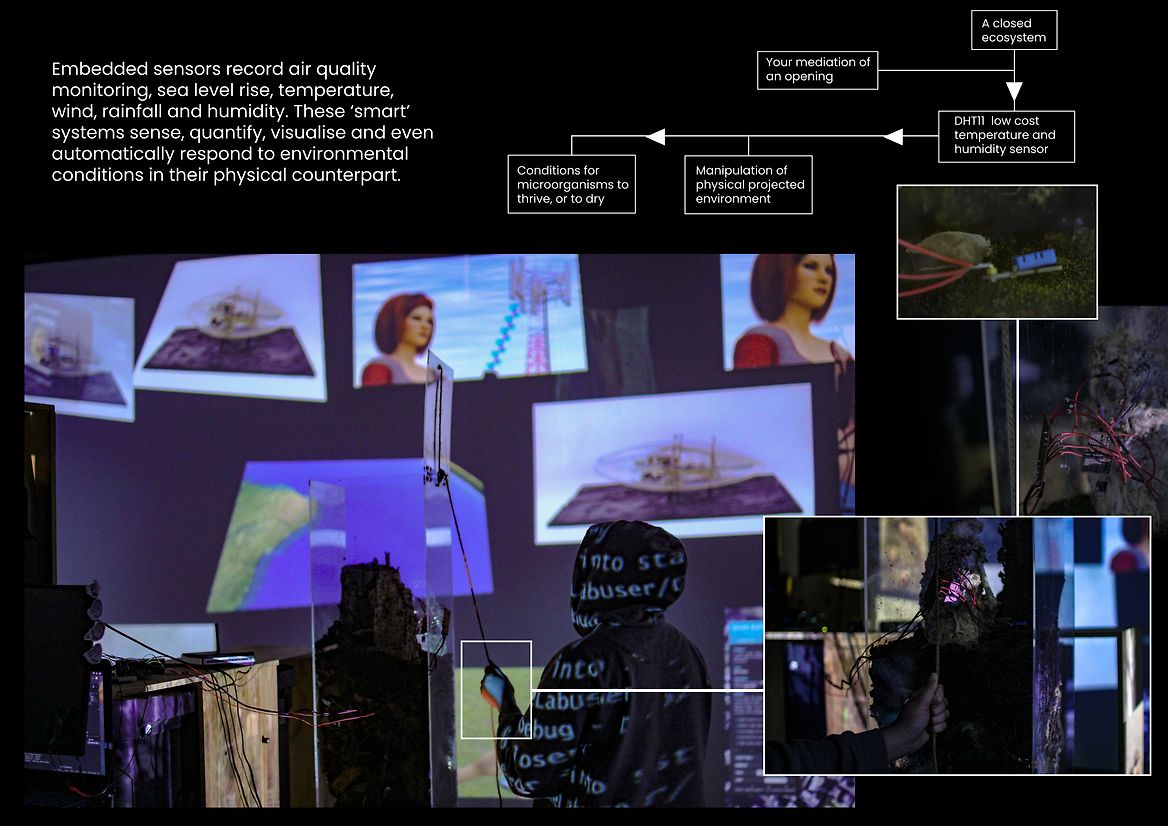 Three ground projectors map videos onto the surfaces of the central objects, cryptically suggesting how you can interact with the work. Sensors and electrical components used to feed the function of the digital twin drive the interactivity of the installation. Cameras serve machine vision software - motion, light, temperature and humidity detectors respond to change, and analog cables complete their circuit with some human help. Information is passed around New Smart City’s network, controlling its virtual worlds and video displays, responding to you as you respond to it.