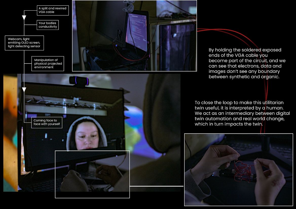My approach here is to first reveal and make tangible the physical construction of the twin through interacting with sensors, networks and materials. And following that to reveal the philosophical or societal construction of the twin in threading video works onto these various interactions.
