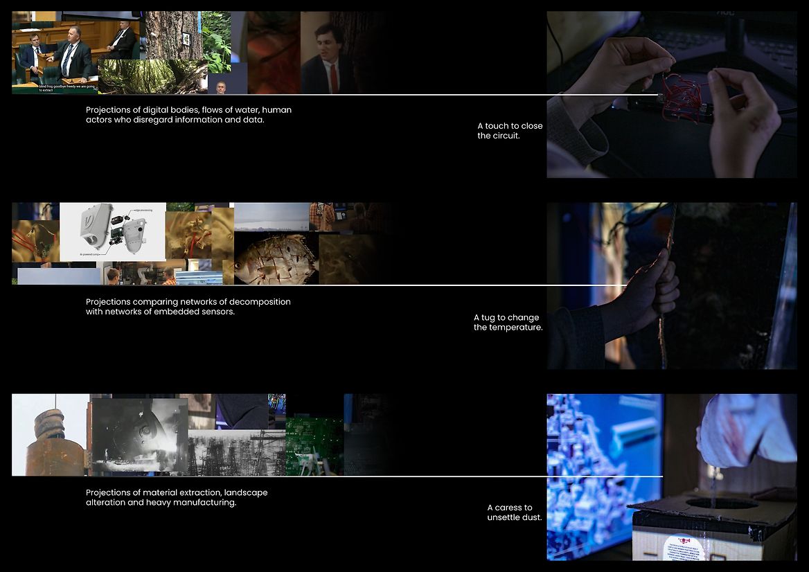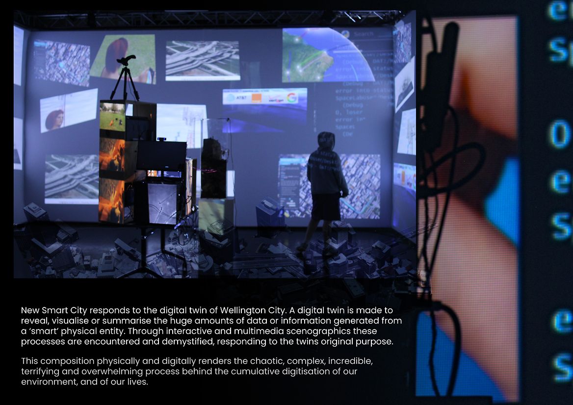 Machine vision, journeys and processes of manufacturing and assembly, human interpretation, and a quantification of biological and ecological conditions are four aspects of Wellington's digital twin that inspired New Smart City’s interactive works. These points of interaction are arranged in the centre of a 270° projection lab as a cluster of machine parts, screens, light and organic material.