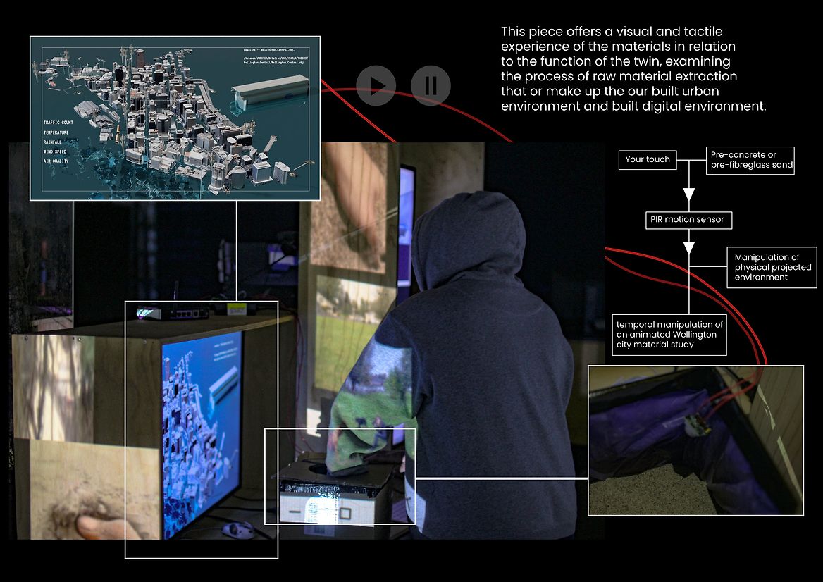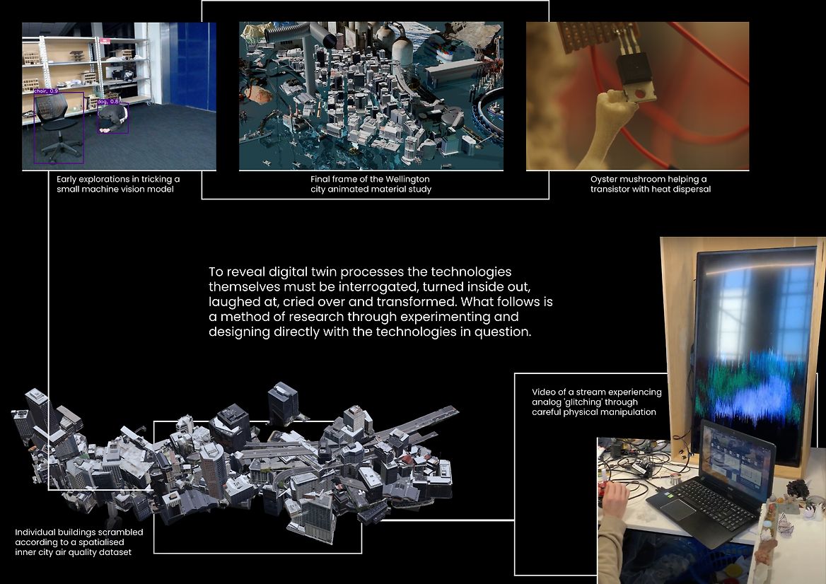 Prioritising automation and data collection, digital twins promise efficiency and unbiased machine observation. As Wellington city implements its digital twin we are given an opportunity to reflect on the culture of digital twins and the relationship between physical spaces and their digital replicas. Digital space isn’t infinite, it takes physical material to construct and maintain, and efficiency and machine-vision objectivity are ideals which tend to homogenise a variety of needs into a harmful majoritarian common good. Technification and technological solutions position themselves as points of progression, but obscure their own processes of creation and ultimate outcomes.
