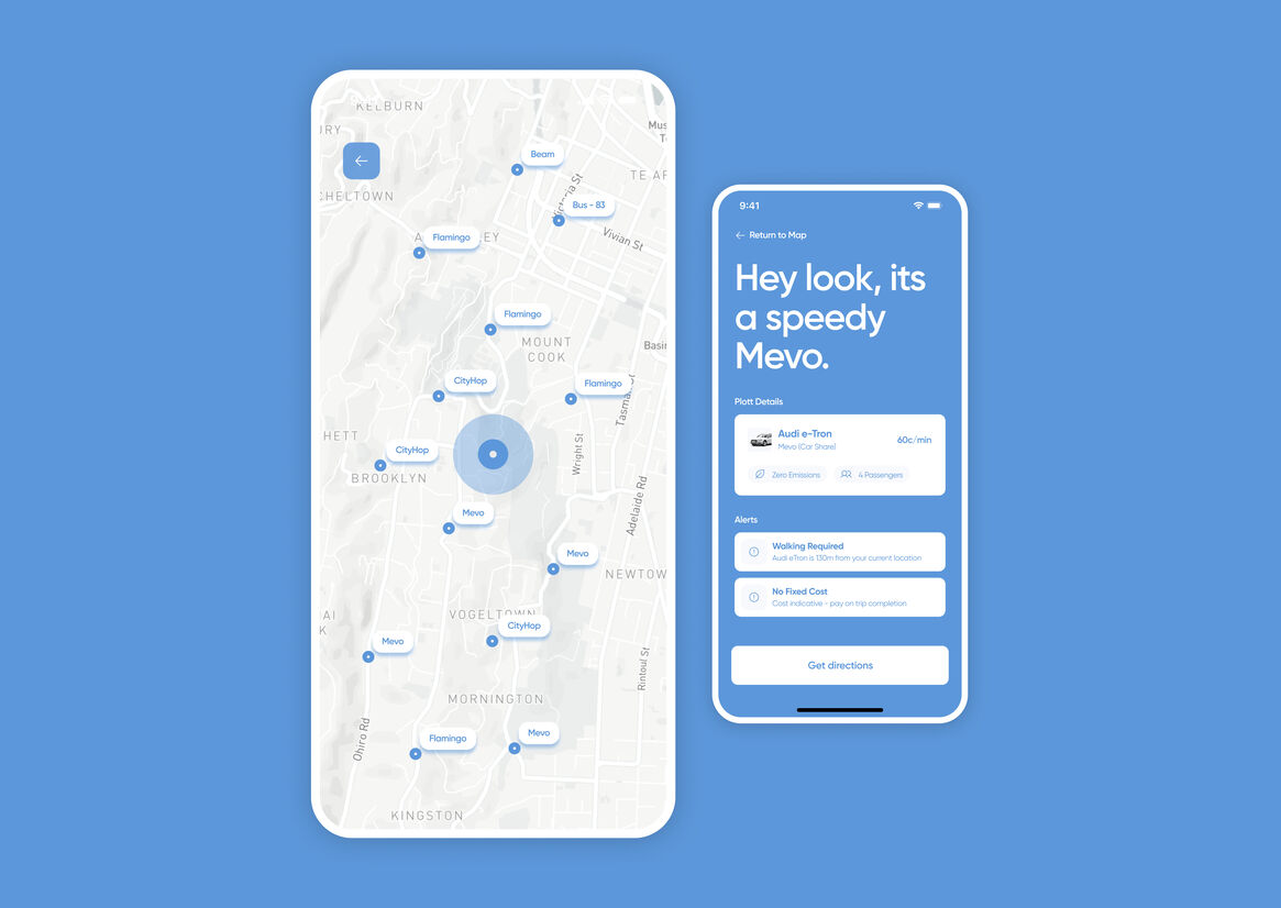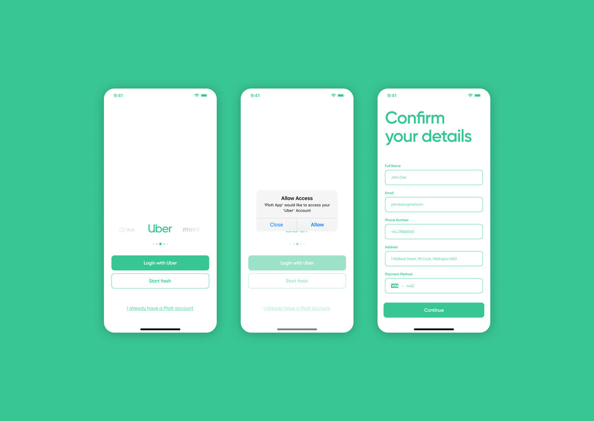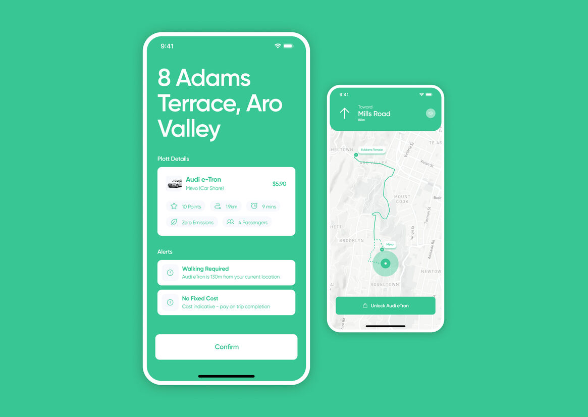 From a functional perspective, Plott was designed to be as quick and easy to use as possible. The app is directly competing with the convenience that a car possesses - therefore, Plott needed to be quick and free from friction. The onboarding process was simplified to allow accounts from existing transport providers to be used. This means that the account details you currently use for Uber, Ola or Mevo can be used to get you set up with Plott. From there, it's as simple as searching for your destination, or selecting a nearby service from the map.