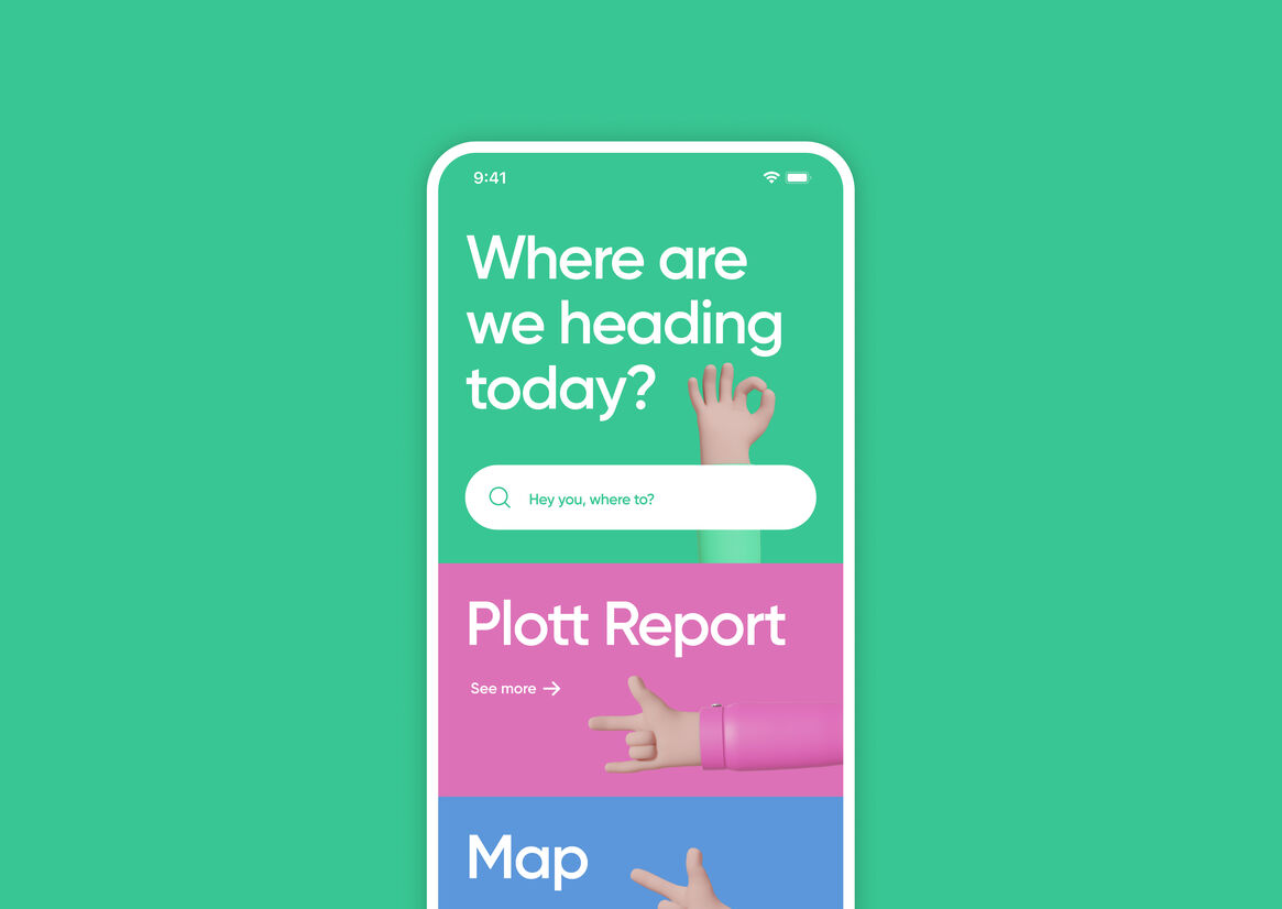 From a visual perspective, Plott was designed to make a bland transactional experience more lively and exciting. Typically the commute (or any process of getting from a-to-b) is merely a necessity. Plott aimed to make this process a memorable one - to make the trip feel like part of the plan, rather than just an enabling factor. Plott has a whimsical personality - the combination of a bright colour scheme and the clay hand motif combine to make Plott feel human and inviting.
