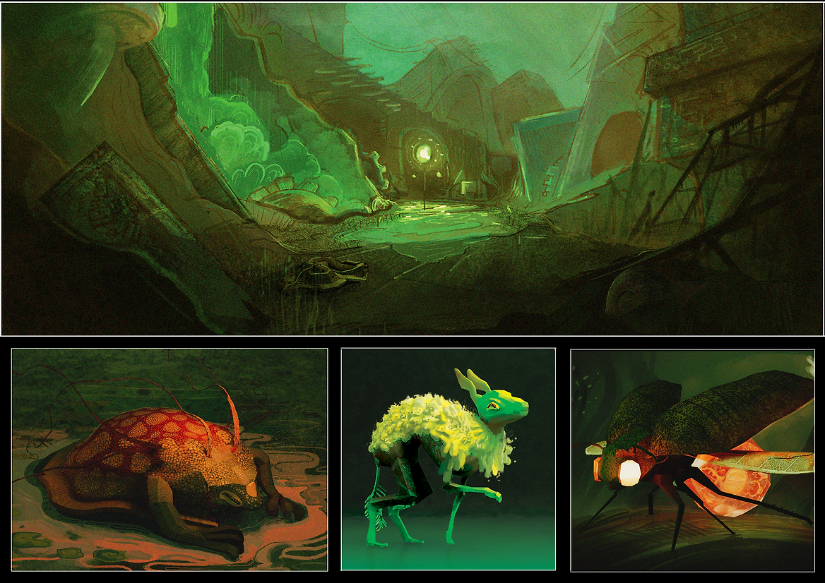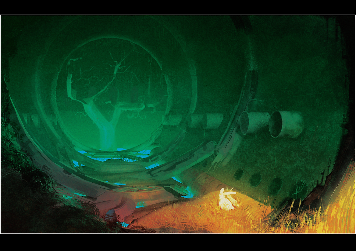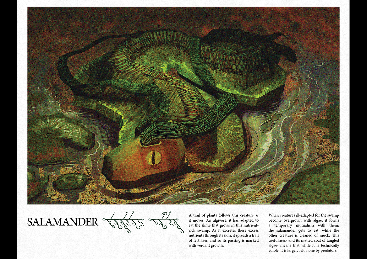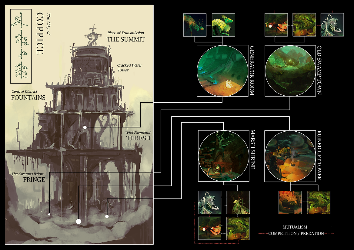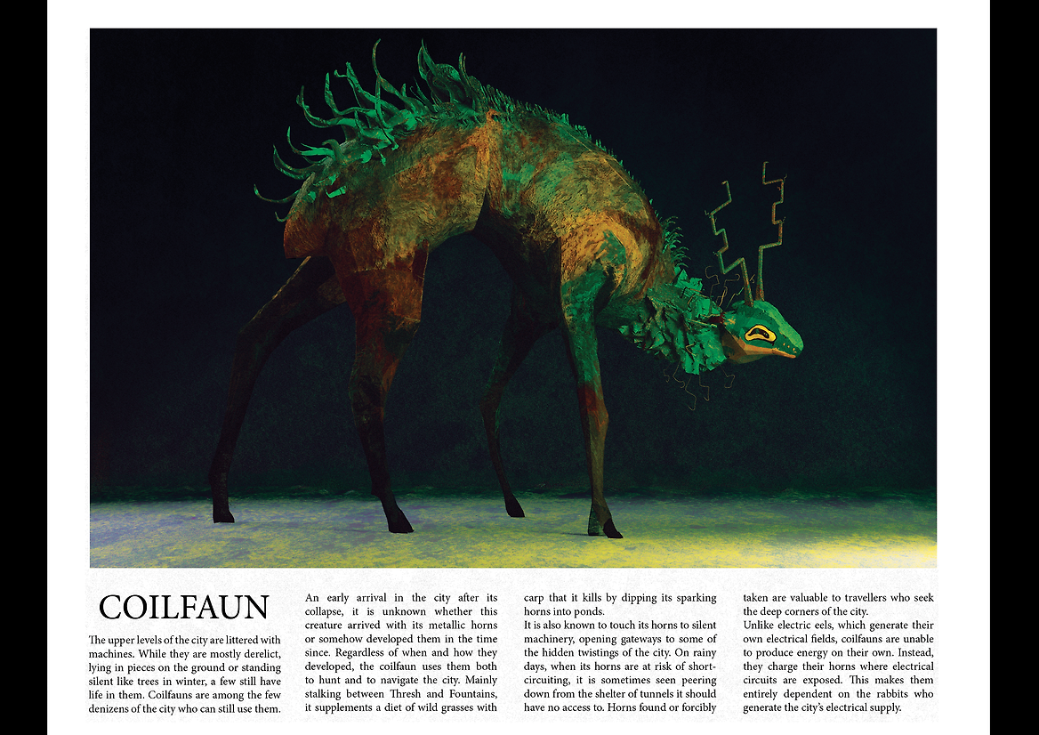 Long-term abandoned land can harbour plants and animals that struggle to survive elsewhere. The creatures of Substrate are designed in conjunction with their environments, creating a fictional ecosystem where creature and habitat are dependent on each other. Environments and the niches they provide are a product both of a place’s own history and of the animals that live there. The city’s streetlights, for example, are powered by hares whose movements rotate the city’s ancient power turbines where they shelter, bringing light into the dark places of the world. The light this provides allows plants to grow and creates new habitats.