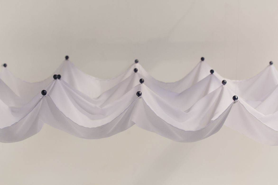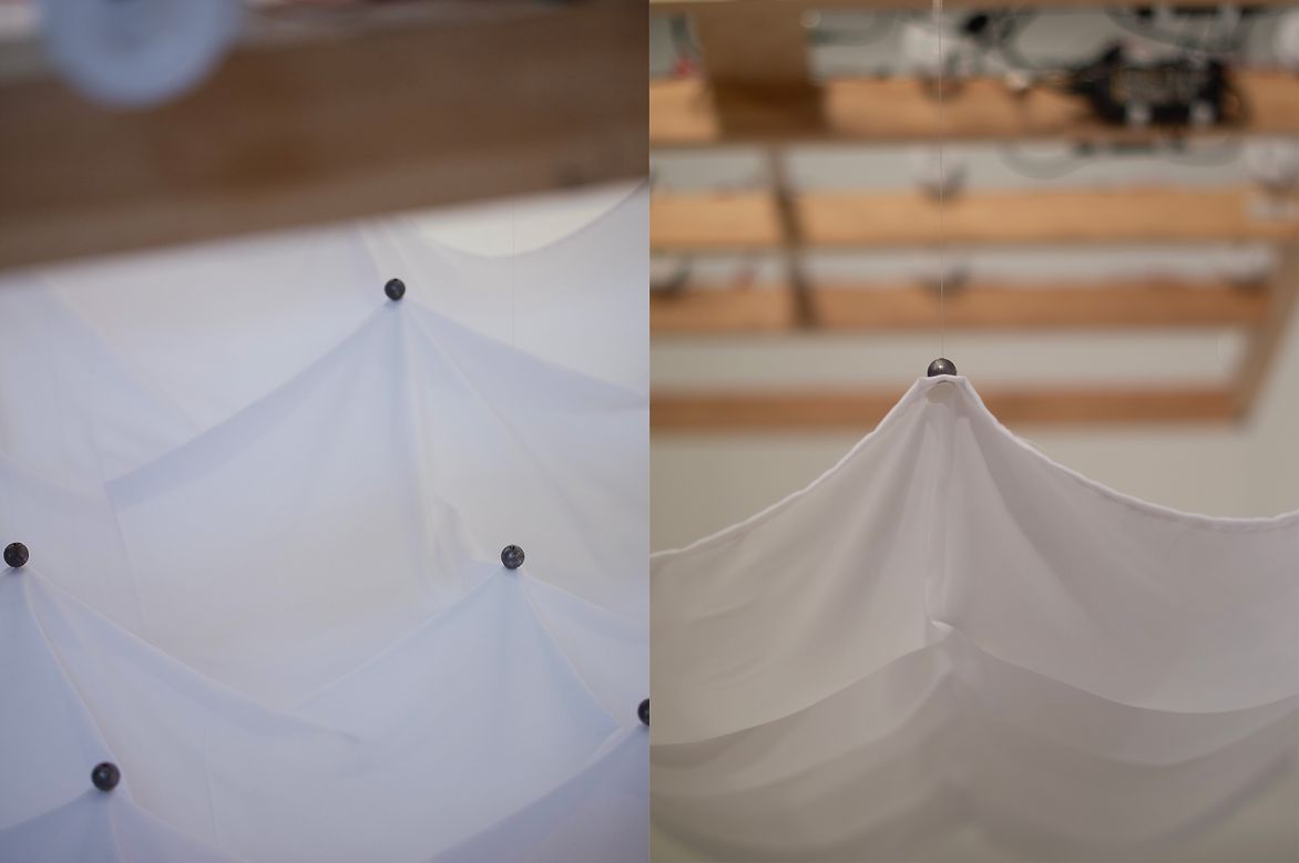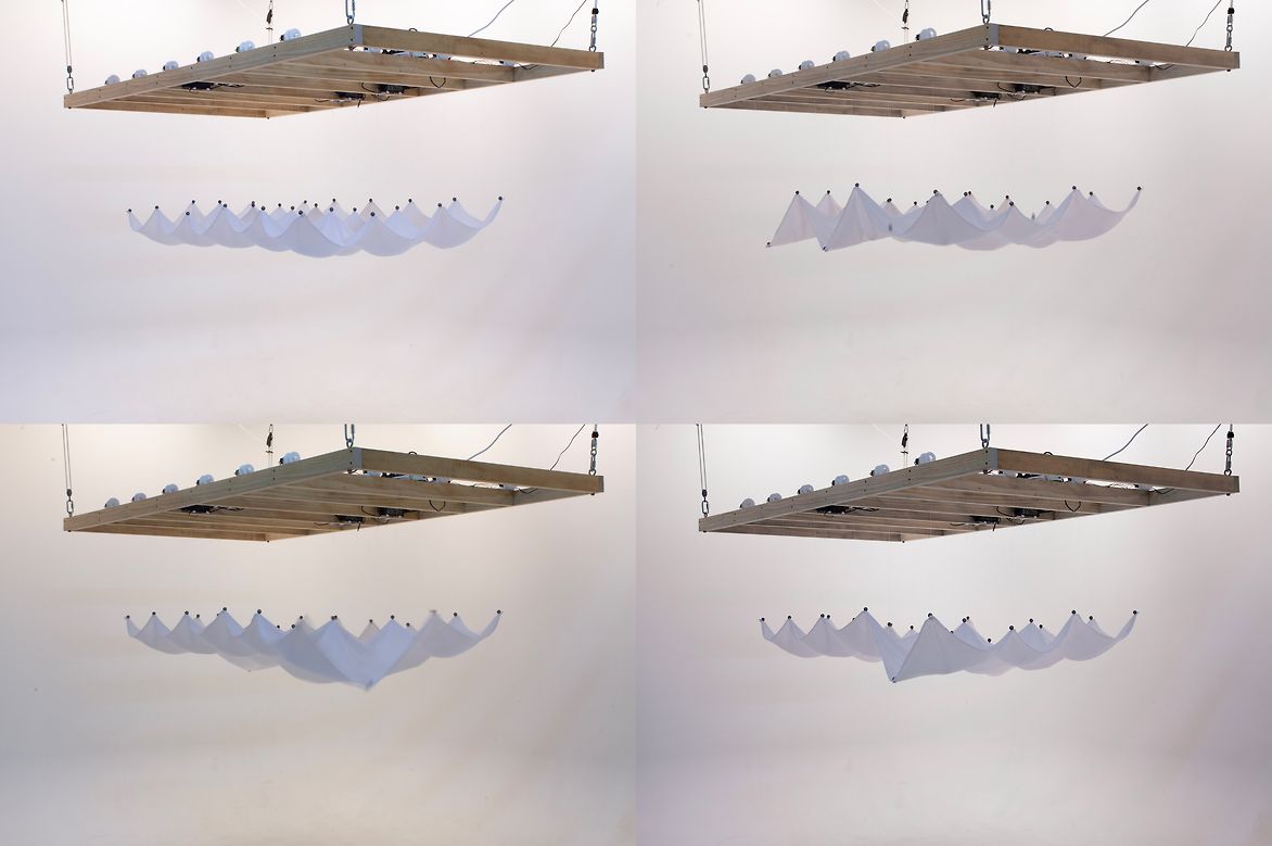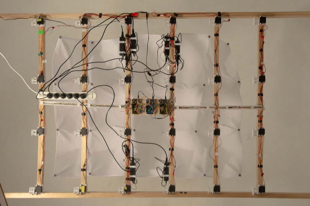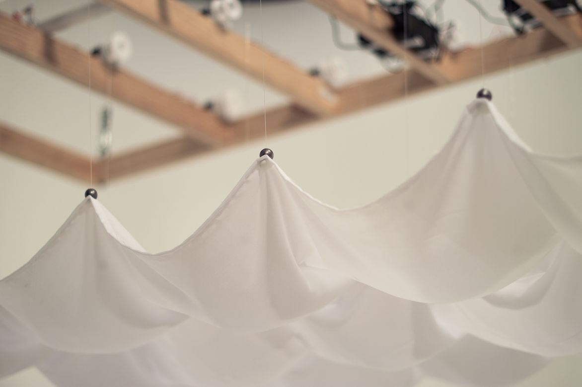 The result is Anodos, a kinetic ceiling that rises, falls, and drapes based on sonic input. Constructed from georgette fabric suspended in a timber frame, the movement is driven by 24 actuators controlled via Arduino. Sound is analysed using audio-processing software, broken into frequency data, and then mapped to the motion of individual servos. Though not operating in real time, the system creates a continuous and evolving spatial response.