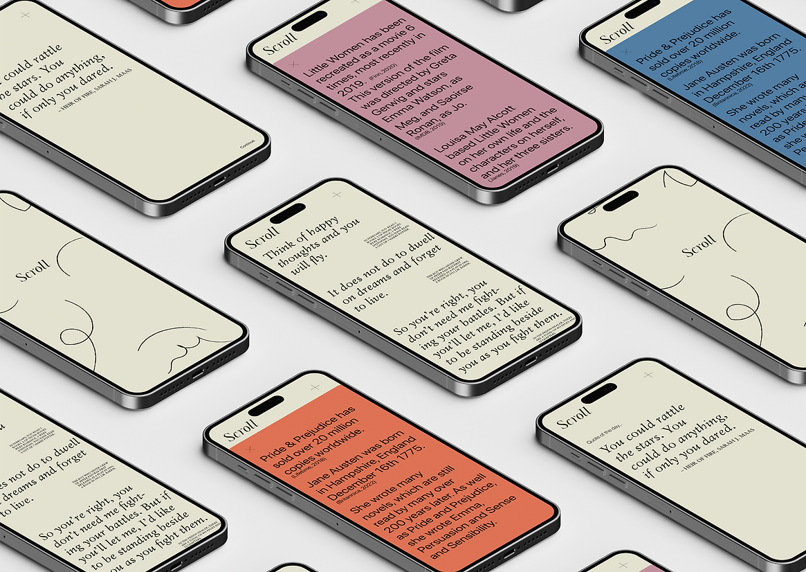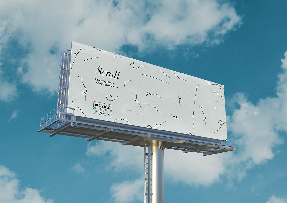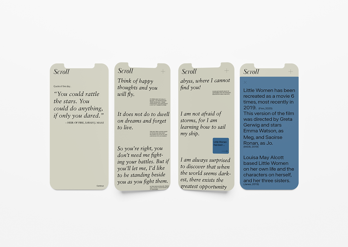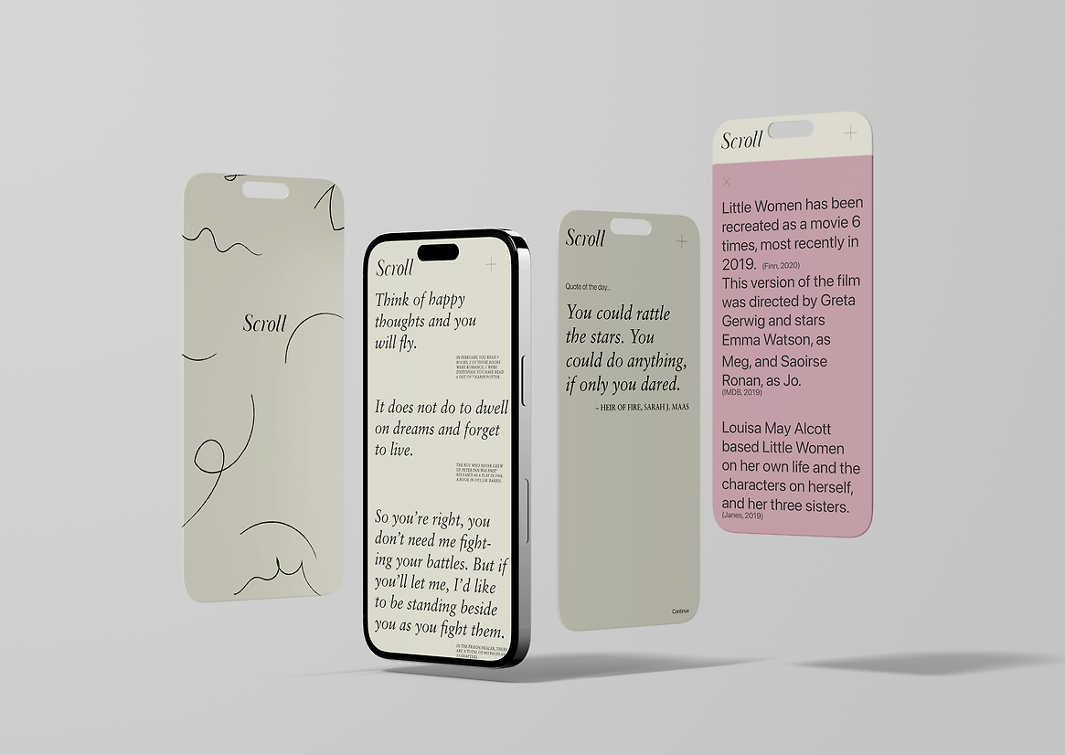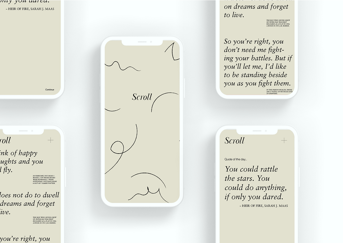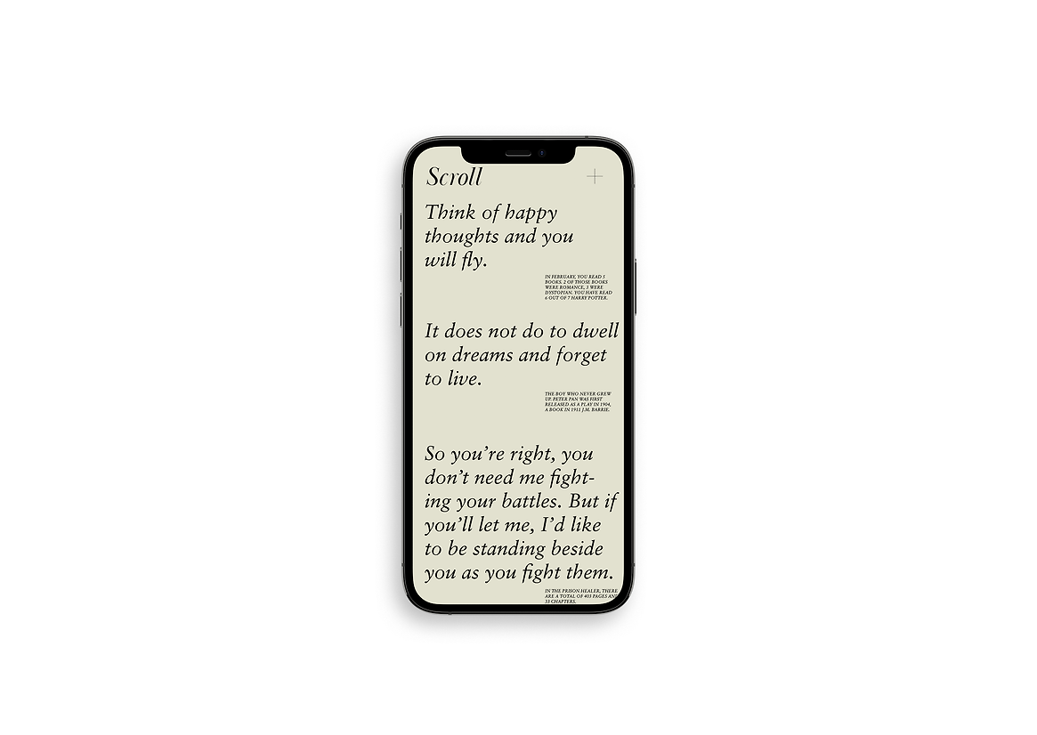 My response to this design opportunity was Scroll. Scroll is a poetic data visualisation app that presents a visual log, or scroll, of one’s reading habits, with a focus on the user’s favourite quotes and passages. Presented as an archive of memories, the app allows the user to reminisce on the books they have previously read. The data collected is represented as a typographic scroll, a beautiful and poetic experience for the user with a minimal interface that has a tactile, hand written quality.