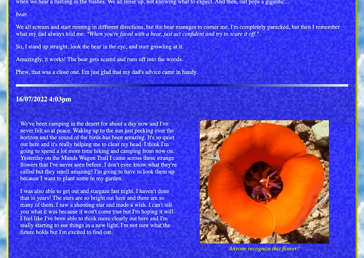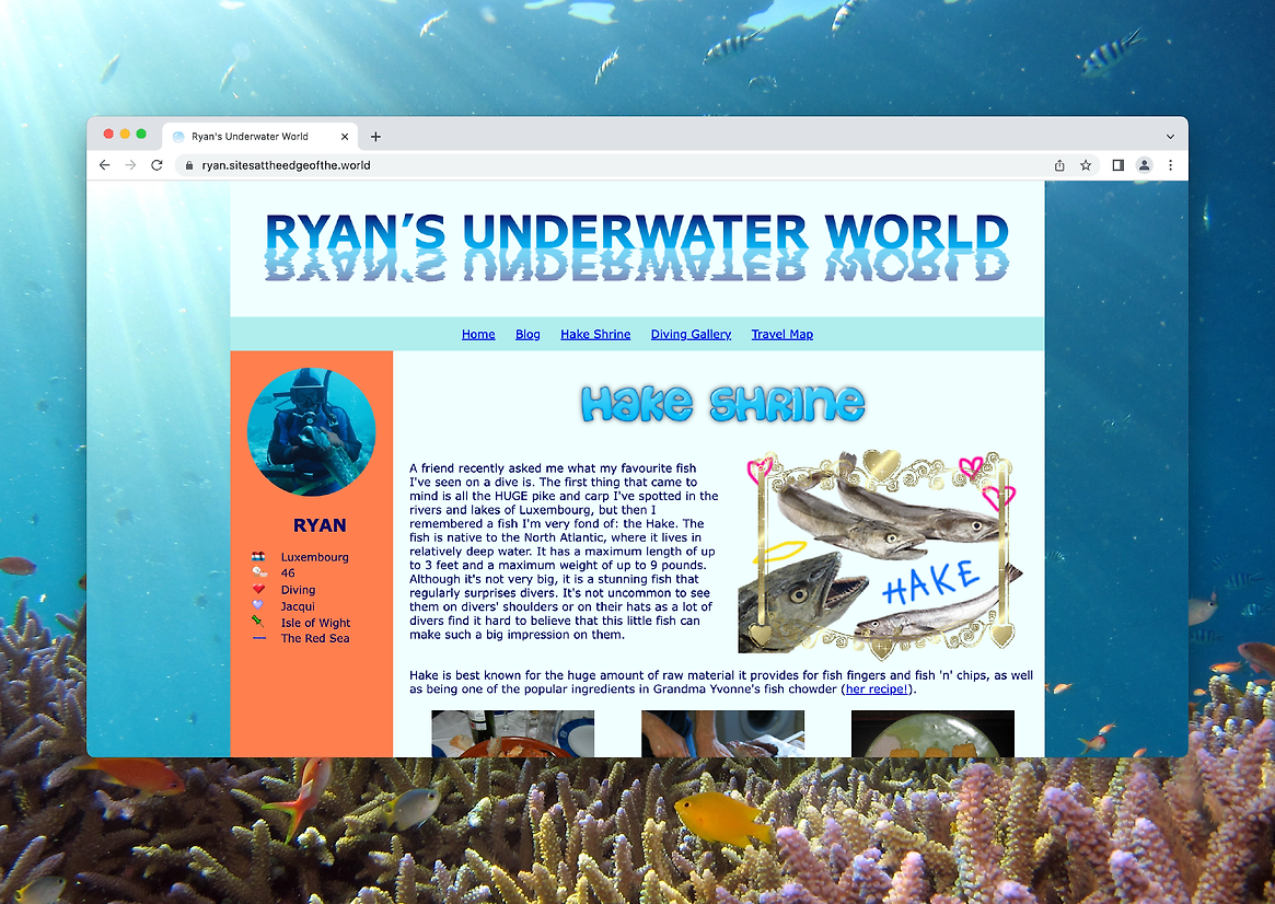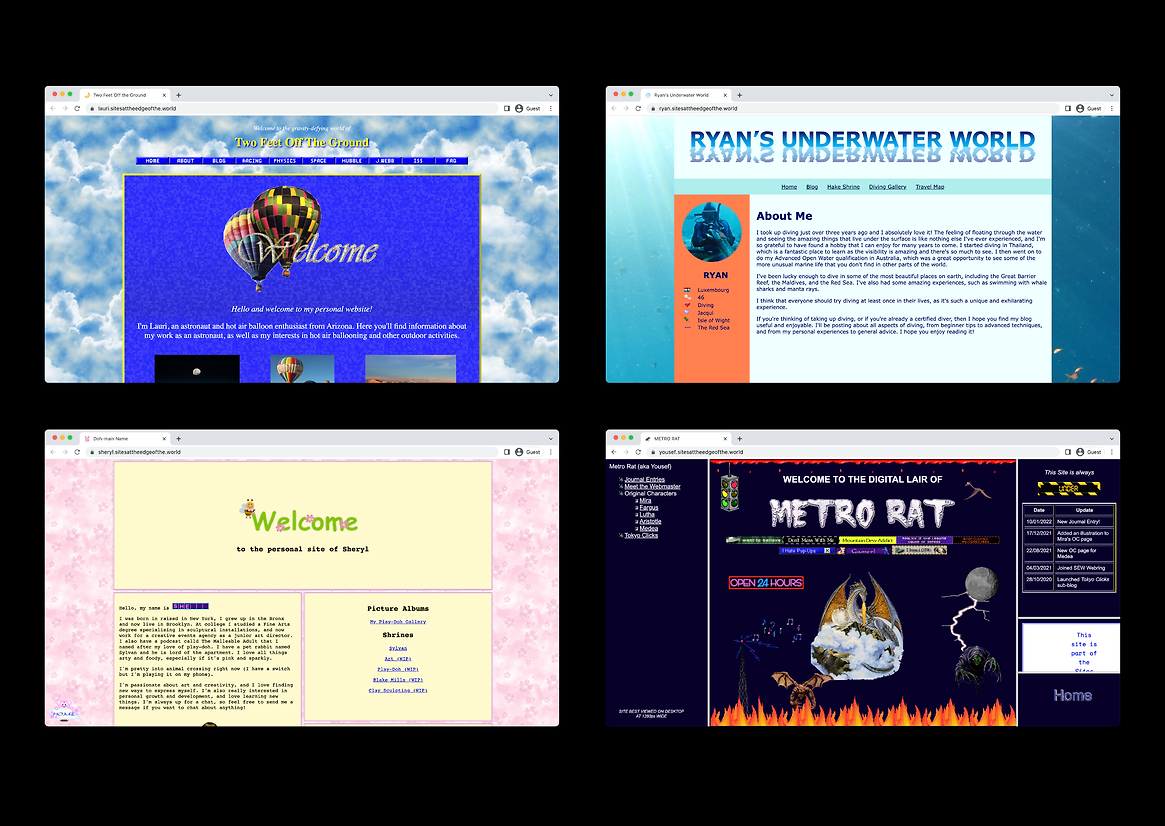 The identities that emerged from the iterative world-building process – An Astronaut, a diver from Luxembourg, a DnD obsessed Janitor, a CFO/Renaissance-buff, and a play-doh loving podcaster – became three-dimensional entities through blogs, shrines, and ‘about me’ pages written by OpenAI's GPT-3. Each website is imbued with the unique visual perspective of its ‘owner’. The approachable curves of Comic Sans paired with an underwater background for the diver, the scratchy serifs of Garamond with an aged paper texture for the history buff. I also included nods to the identity markers introduced by the AI, whether it be a Lesbian flag gradient or a curation of digital ‘badges’.