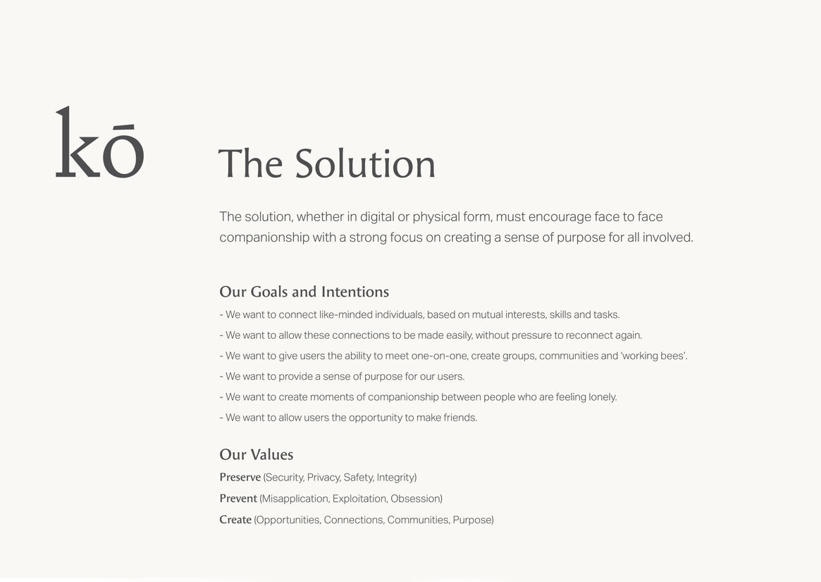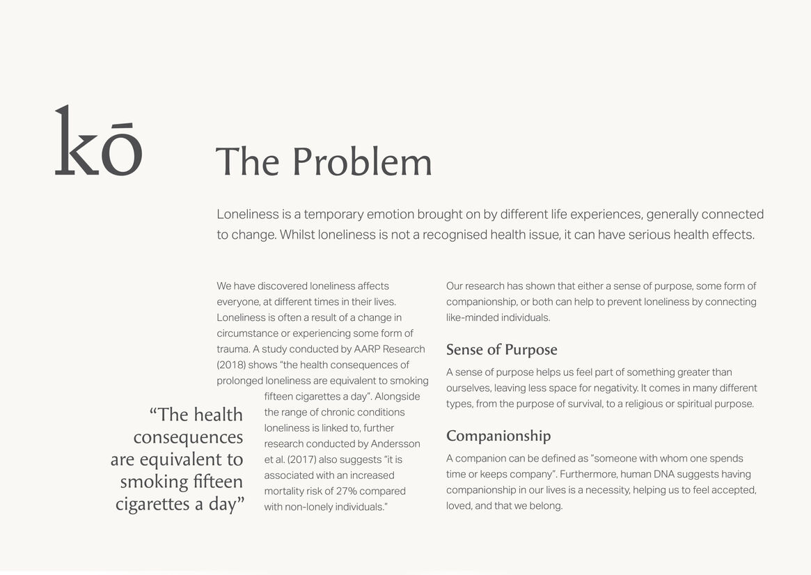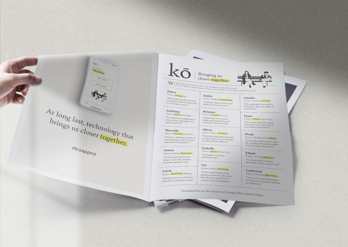 ‘Ko’ is a conceptual platform designed to create connections within communities. ‘Ko’ acts as a facilitator for companionship, connecting like-minded individuals and thus creating thoughtful conversations, the sharing of ideals and shareable, poignant moments. ‘Ko’ helps to instil a sense of purpose among its participants and foster feelings of acceptance and belonging – fundamental human needs which help alleviate feelings of loneliness. A mobile app and a series of print collateral, such as posters and newspaper inclusions, were developed to engage the community at all levels.