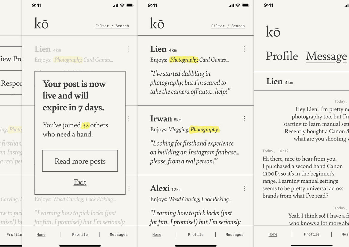The name ‘Ko’ derives from Māori, which carries the meaning “to sing (of birds)”, and “to resound”. The project is branded thus to signify users calling out to one another and connecting with others outside of their comfort zone. Thematically, the project provides a refreshing experience that is an antidote to mainstream social media apps. The design tone is curated to be neutral and non-confrontational, using language that is welcoming and exudes warmth. The typography, colour palette and accompanying illustration style lend to the overall design experience. The app design is developed to be intuitive and caters to a wide section of the community, while giving focus to the target audience. Print mediums are used to place marketing messaging to direct the target audience to the online platform.