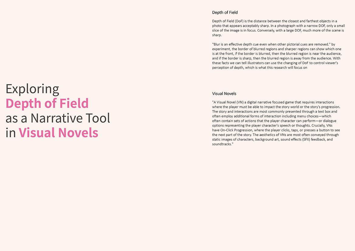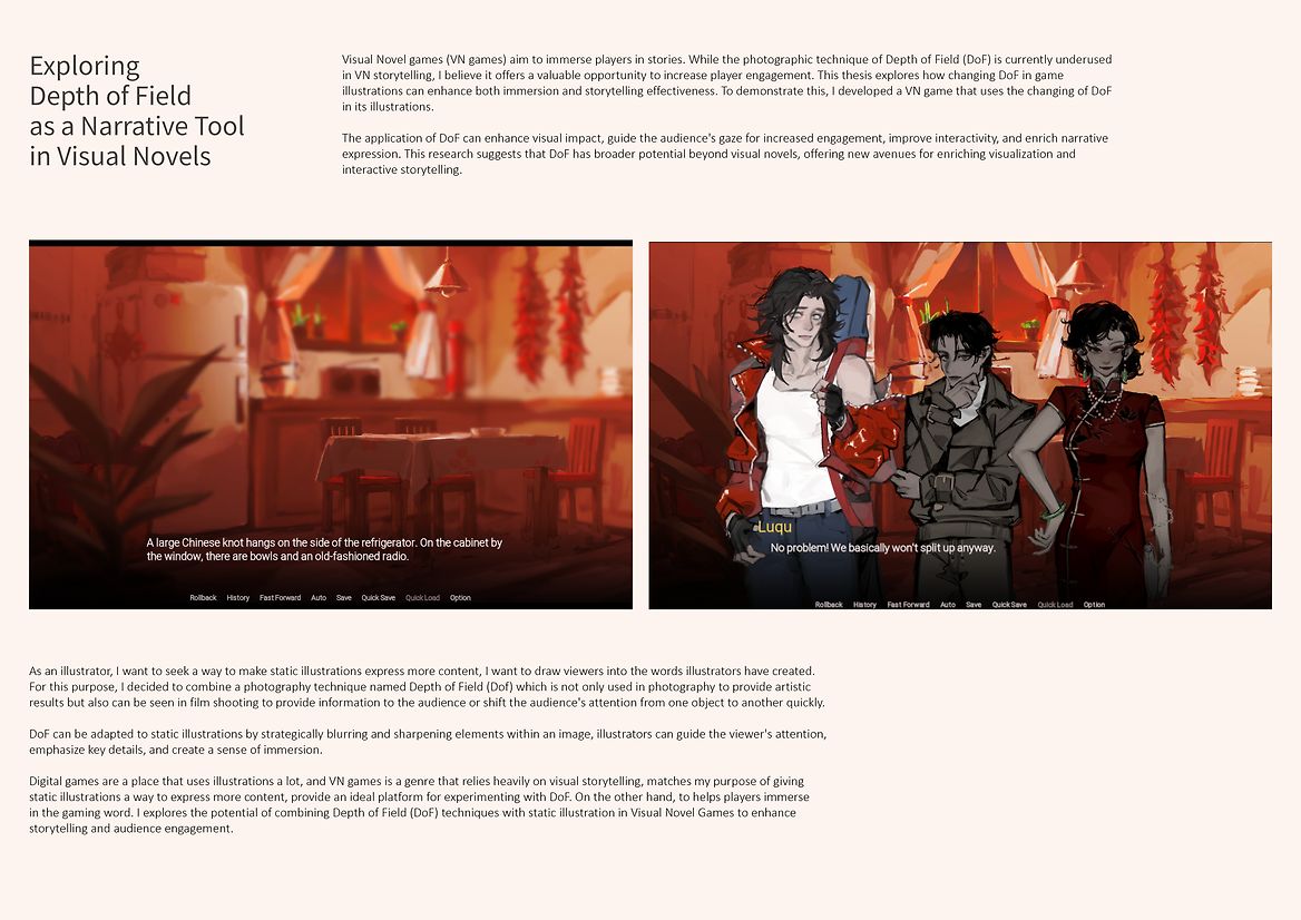 Visual Novel games (VN games) aim to immerse players in stories. While the photographic technique of Depth of Field (DoF) is currently underused in VN storytelling, I believe it offers a valuable opportunity to increase player engagement. This project explores how changing DoF in game illustrations can enhance both immersion and storytelling effectiveness. To demonstrate this, I developed a VN game that uses the changing of DoF in its illustrations.