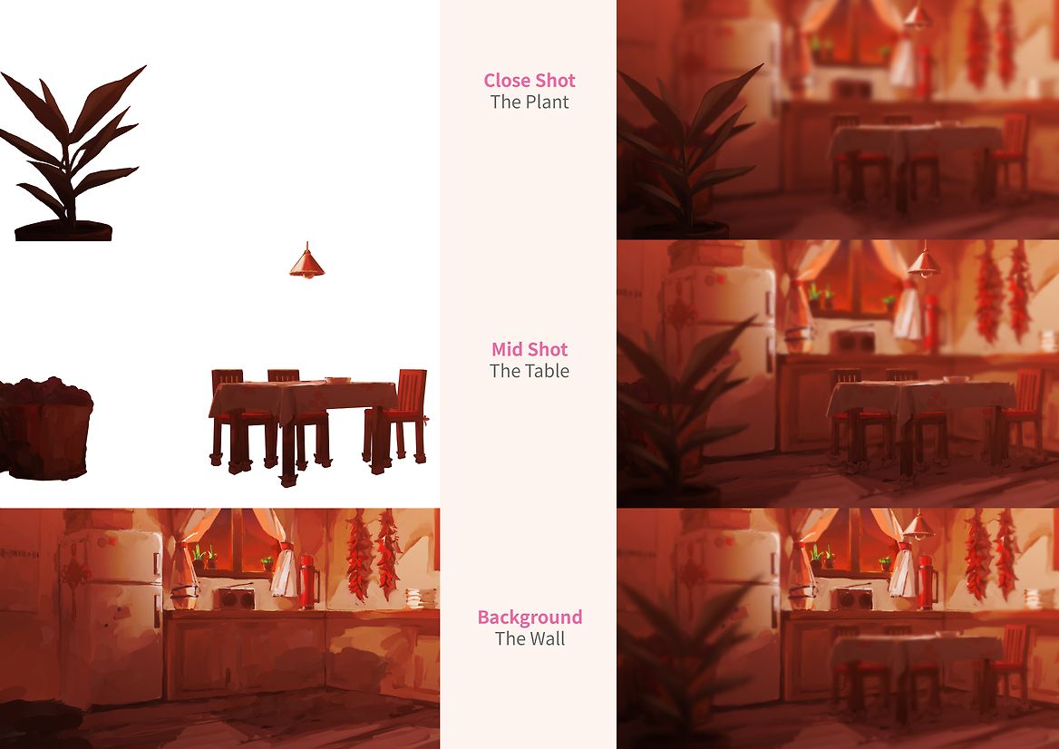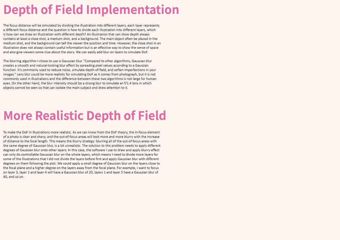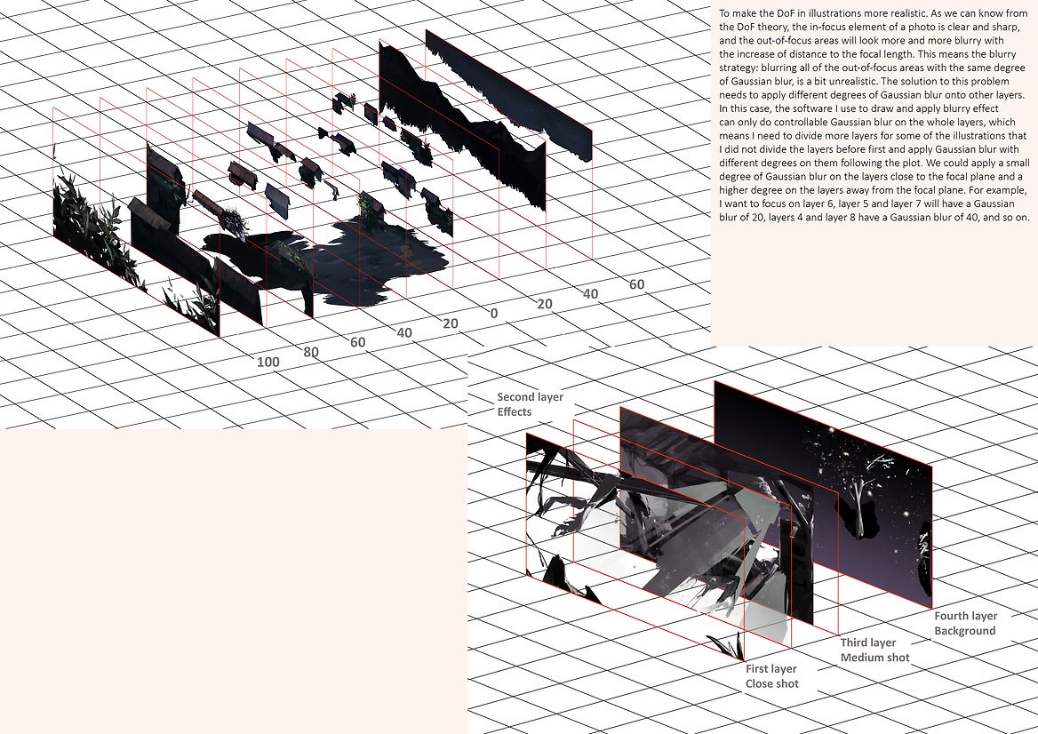 "Illustration" is not a word that can be easily defined, it is not art or graphic design, it lies in between. Illustrators use illustrations to visualize texts, stories, or other abstract contents. As an illustrator, I want to seek a way to make static illustrations express more content, I want to draw viewers into the words illustrators have created. For this purpose, I decided to combine the photography technique named Depth of Field (Dof) which is not only used in photography to provide artistic results but also can be seen in film shooting to provide information to the audience or shift the audience's attention from one object to another quickly.