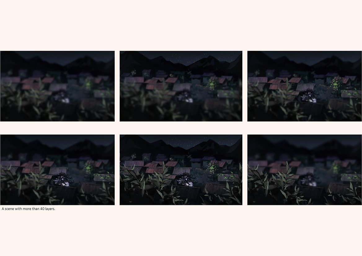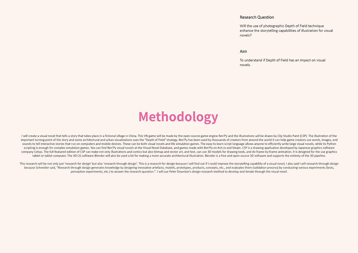 DoF can be adapted to static illustrations by strategically blurring and sharpening elements within an image, illustrators can guide the viewer's attention, emphasize key details, and create a sense of immersion. Digital games are a place that uses illustrations a lot, and VN games is a genre that relies heavily on visual storytelling, matches my purpose of giving static illustrations a way to express more content, provide an ideal platform for experimenting with DoF. On the other hand, to helps players immerse in the gaming word. This project explores the potential of combining Depth of Field (DoF) techniques with static illustration in Visual Novel Games to enhance storytelling and audience engagement.