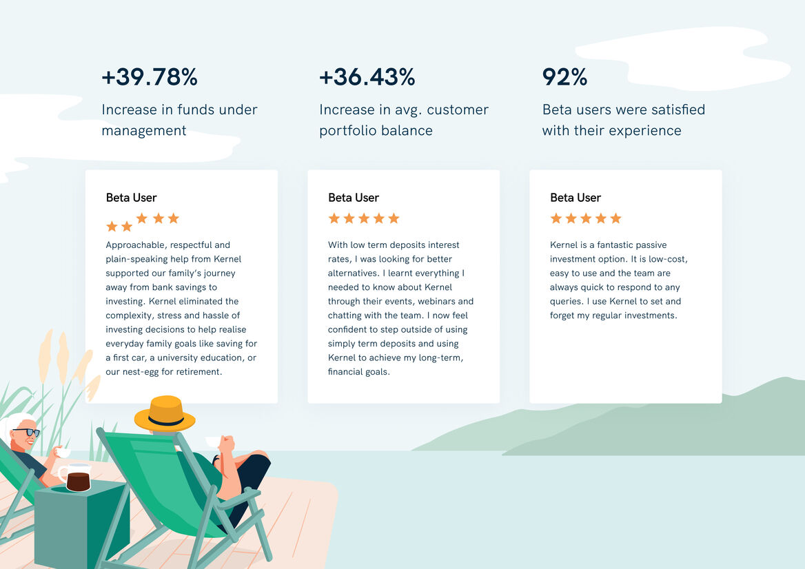 One way to overcome this challenge was to create a standardised solution that felt bespoke to an individual's needs – ideas for which we delivered over a series of agile design and development sprints. Sprints started by sketching low fidelity solutions as a team before using a newly developed component library to bring to life designs we could share for feedback. We tested progress with users every week before inviting a core beta group of 120 existing Kernel investors to start using a functional MVP. Having a direct line of contact to our design team created a valuable feedback loop, empowering us to rapidly test and iterate before pushing live.