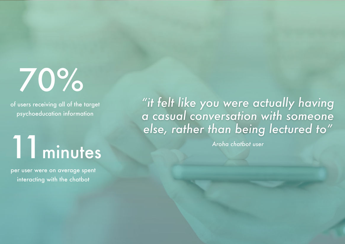Still in clinical trials, it will take time to understand the true impact but anecdotally, Aroha is making a difference for young people. Early usage stats showed that users engaged for an average of 11 minutes at a time, with 70% receiving all of the target psychoeducation information. The COVID-19 pandemic provided an intense real-world test, delivering CBT to young people via an accessible mobile interface to alleviate anxiety/depression symptoms and lift their sense of wellbeing.