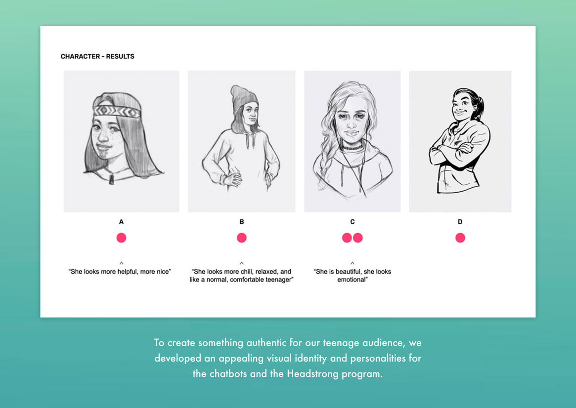 Interviews with 12 teenagers provided key insights. They told us that having someone to talk to was something they all believed they would use or have a friend that would use it - and that a virtual character would be easier to talk to than friends or family.