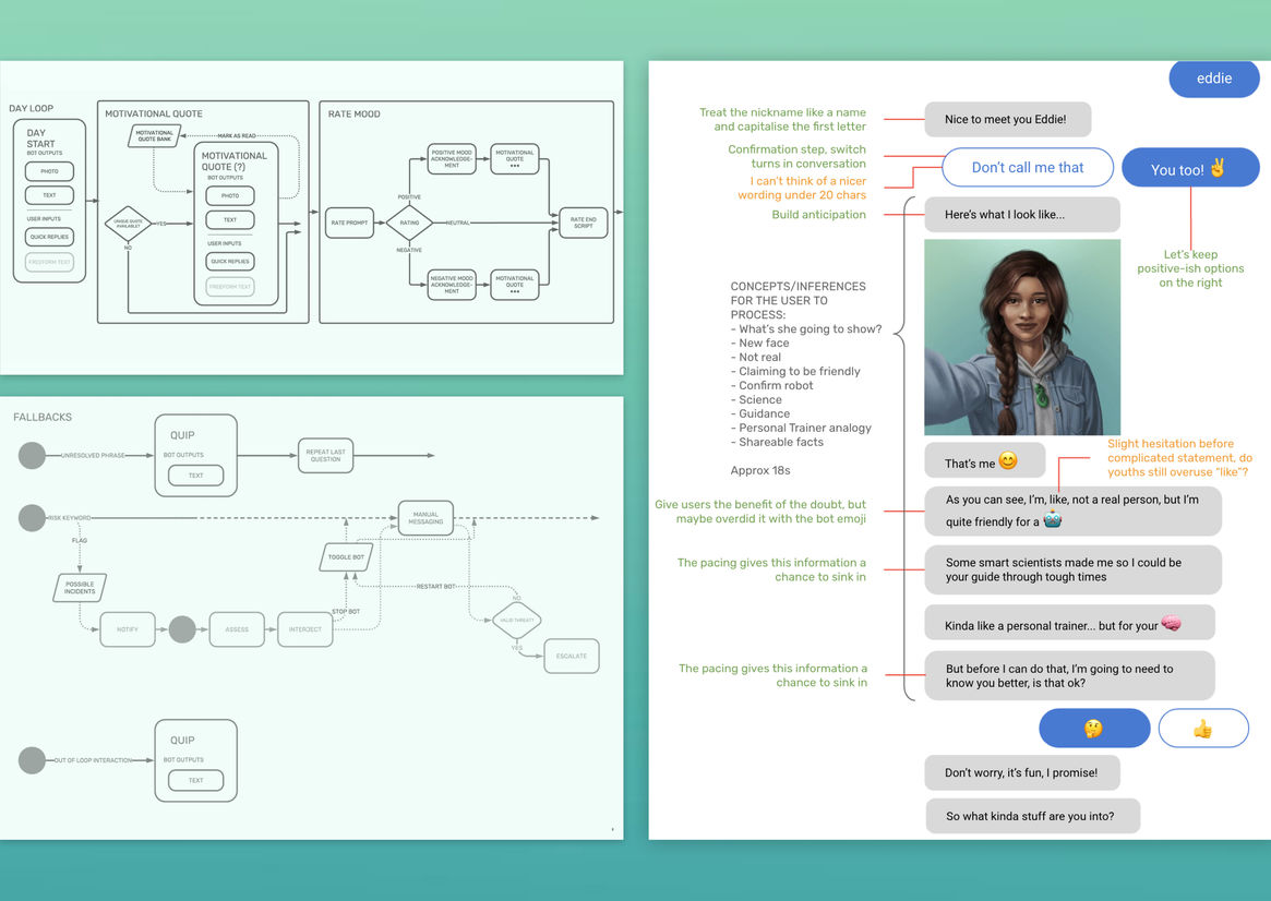 From the preliminary research we ran workshops that resulted in the conception and build of digital friends. These personified chatbots would be available 24/7 on Facebook Messenger; a format with comparable levels of patient treatment efficacy to a website, mobile apps and AR experience, as well as a lower technical overhead + content creation unit cost.