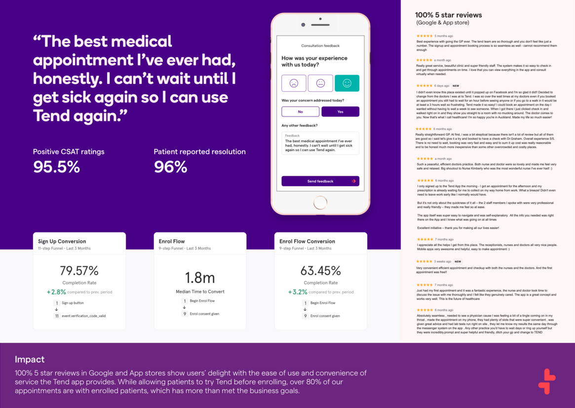 The Tend app has achieved 100% 5 star reviews in Google and App stores, and reviews show users’ delight with the ease of use and convenience the app provides. 80% of our appointments are with enrolled patients, which has exceeded business targets. Tend has an enrolled Maori population of 13% (Auckland DHB Maori population: 9%).
