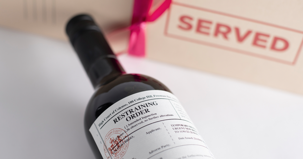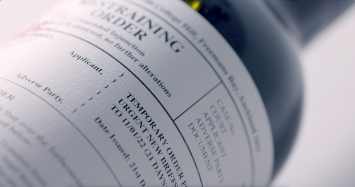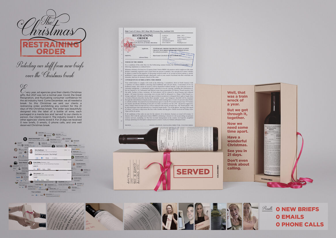 So this Christmas we sent our clients a restraining order, prohibiting any contact for 21 days over the Christmas break. The order was beautifully designed into the label of a bottle of wine, each packaged in a manila box and ‘served’ to our clients in person.
