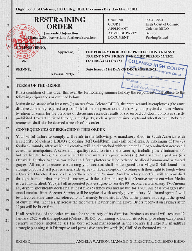 The conditions of order were a cleverly phrased mix of humorous industry insights and harsh legalese. For example, breaching the order resulted in penalties such as “any briefs received after 12pm on a Friday will be lit on fire”.