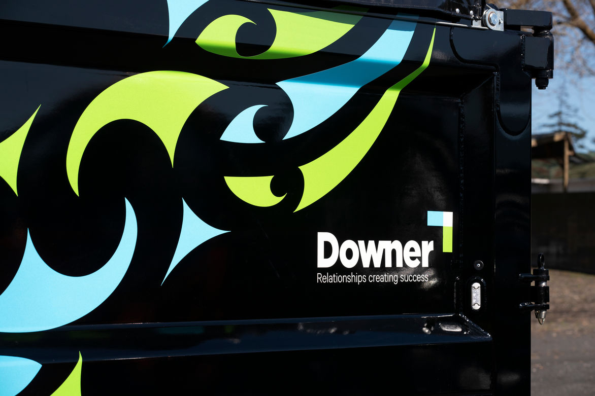Downer has been working in Aotearoa for 150 years, and this connection of past knowledge and experiences, through to the present day is depicted through the takarangi spiral, which sits at the centre of the beautiful design. The hammerhead shark – mangopare, is a representation of abundance and vitality.