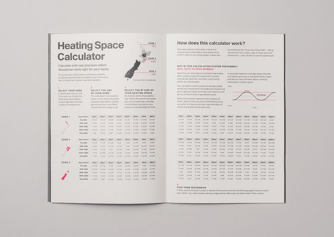 The ‘calculator’ raised a significant design problem given the print format. Based on scientific research carried out by Woodsman, the calculator consists of a four-step process; a matrix between the consumer’s region, the age of their home, and the area requiring heating—giving them an ideal kilowatt number to then be used to identify the corresponding range of appropriate Woodsman fires on the following pages.