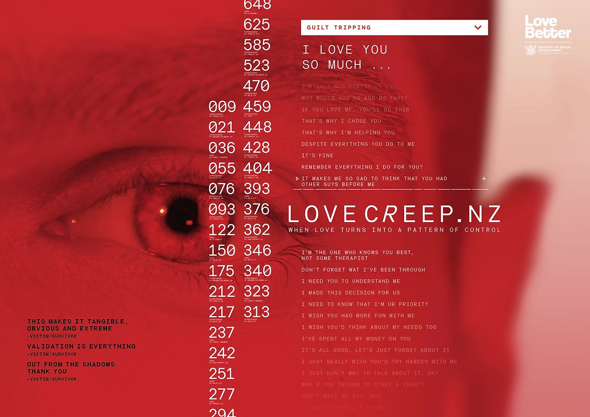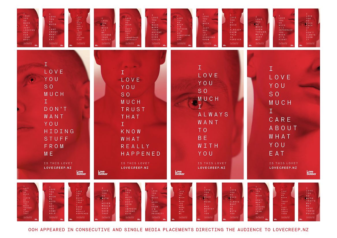 To drive young people to LoveCreep.nz, we leveraged our powerful red aesthetic, with striking 6 second ‘Love Bite’ films, and 30 second patterns based on real people’s experiences. The OOH also cut through on the streets. All of it asks: ‘Is this love?’
