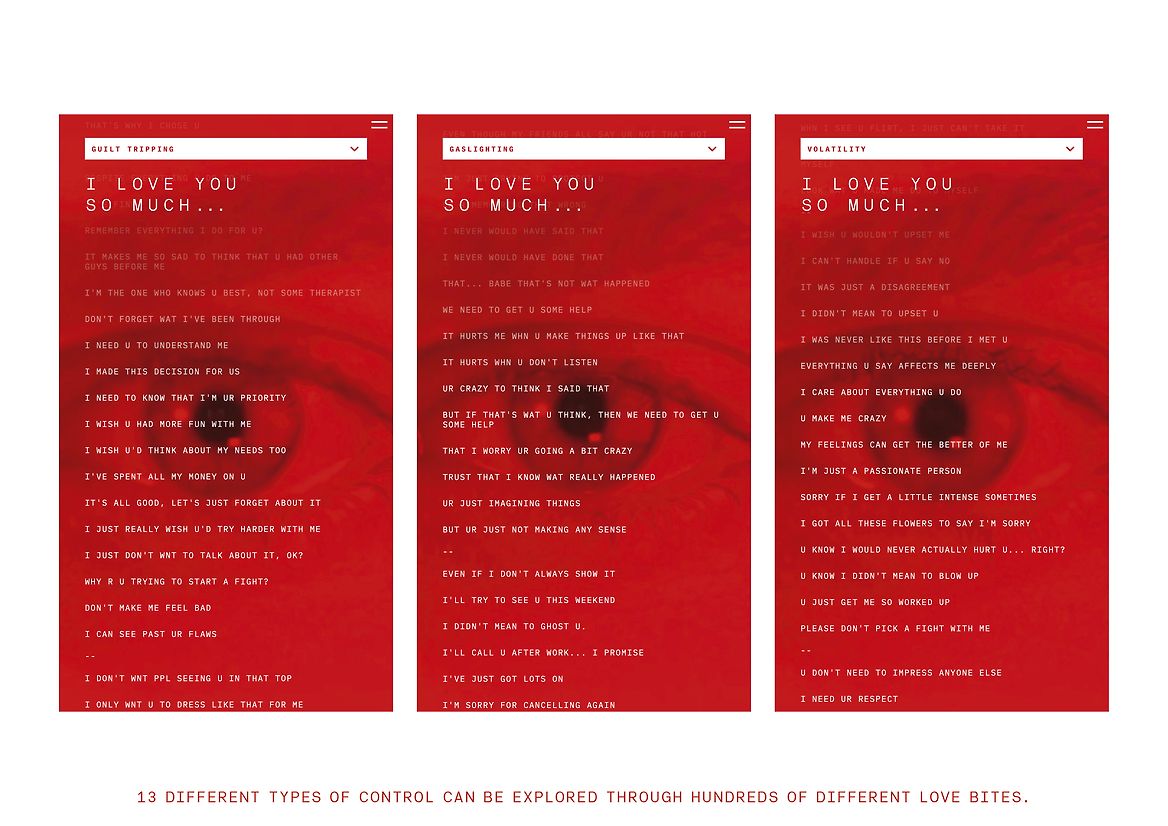 LoveCreep.nz leans into this with an intentionally red-laden mobile-first experience that simulates coercive control. It helps people separate individual ‘loving’ behaviours through ‘Love Bites’ (collected from interviews with hundreds of Victim/Survivors) and identify wider patterns of control.