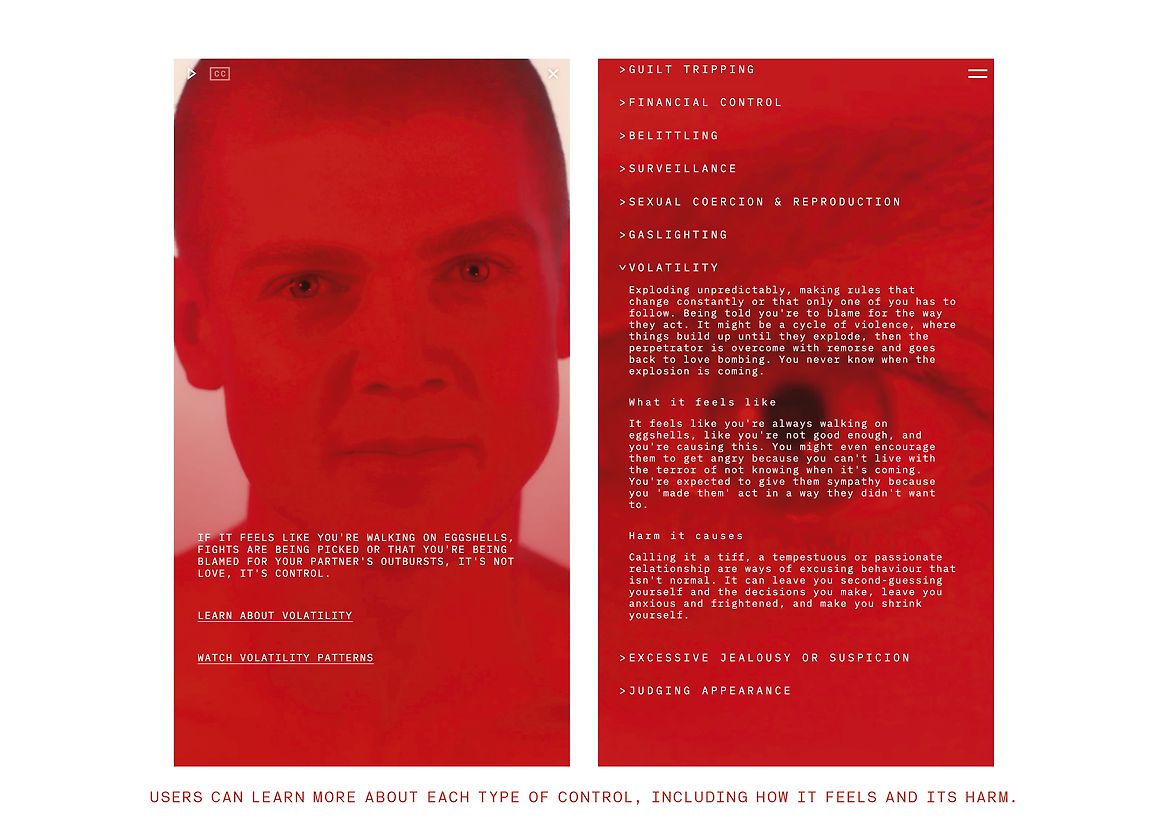 The intense red palette signals both love and danger. The compositions are heightened by the relentless use of the colour. Red is the focal point across the campaign, seeping into every touchpoint: website, films, social assets and OOH. The red serves as a visual shortcut for signaling potential controlling behaviours and patterns of abuse.