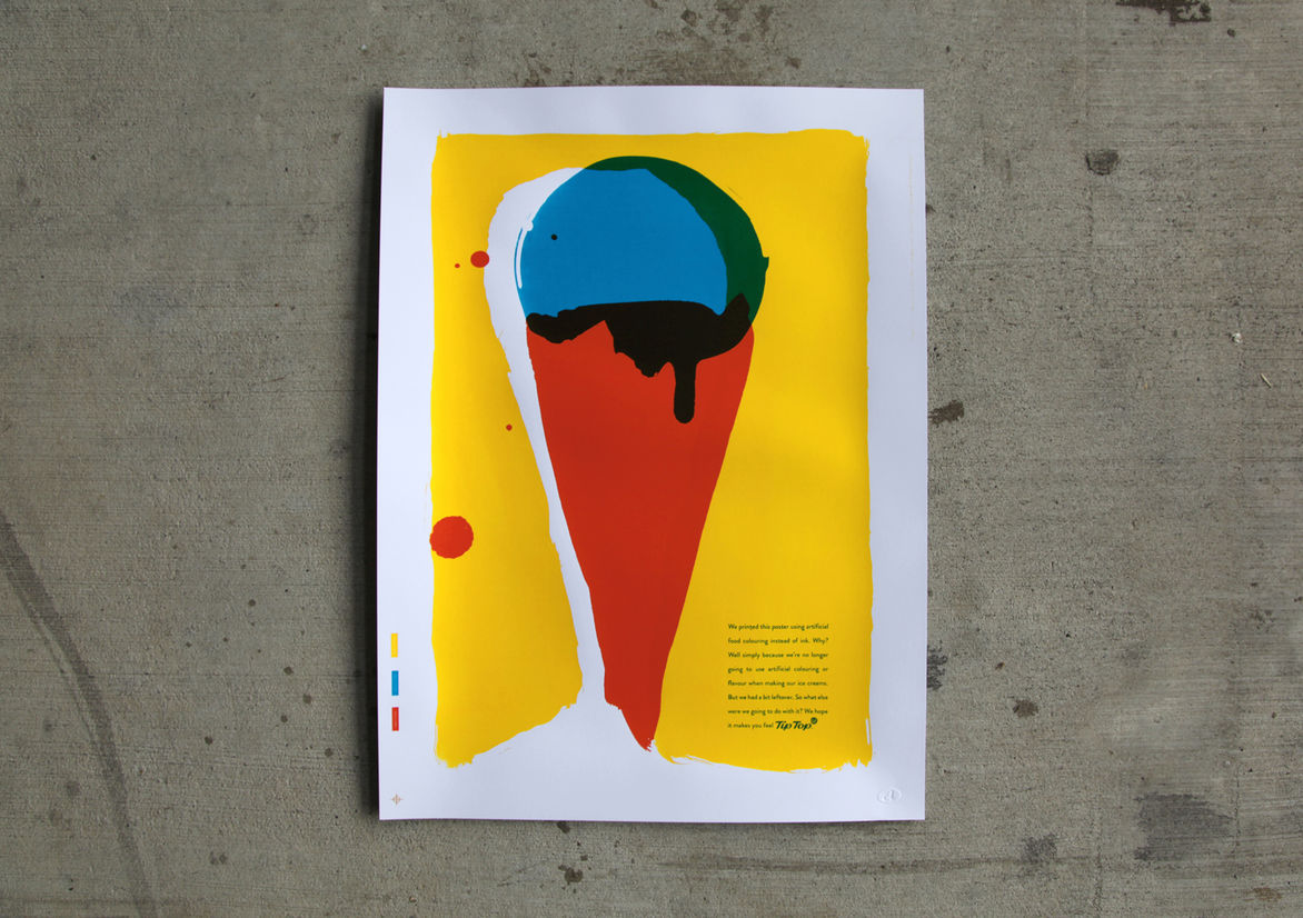 To mark the end of the use of food colouring, these wonderful and vibrant posters are printed using the remainder of the food dyes, when the policy was introduced.