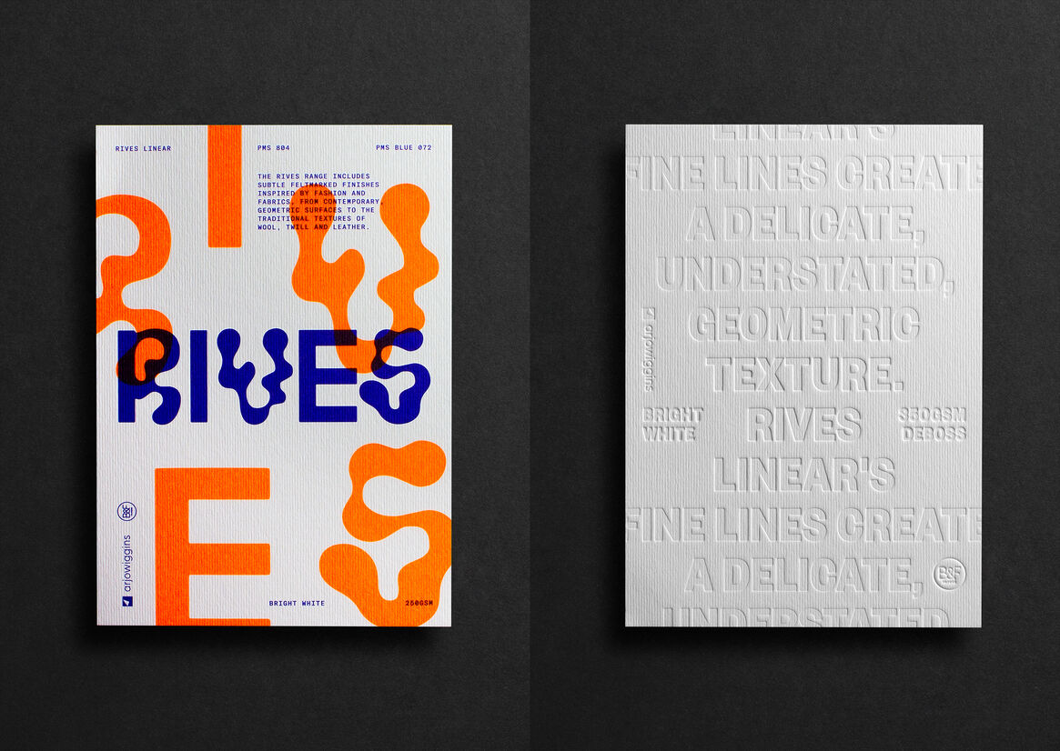 Touchy Feely is an A6 promotional booklet designed to showcase the paper stock ‘Rives’ by Arjowiggins for B&F Papers. The Rives range includes subtle felt-marked finishes inspired by fashion and fabrics. B&F Papers house four ranges: Rives Laid, Rives Design, Rives Linear, and Rives Tradition.