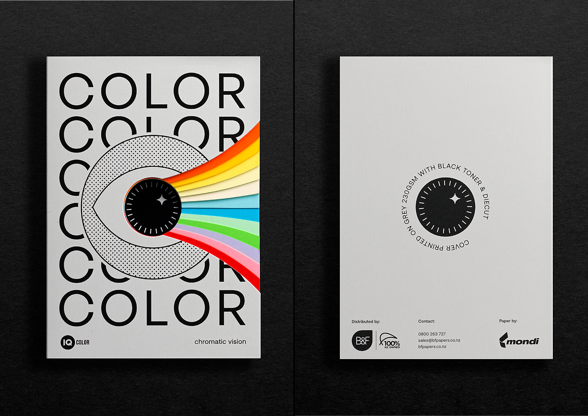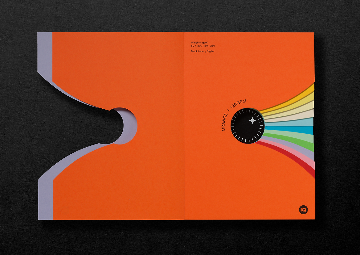 What doesn’t meet the eye, is the craft behind the scenes. This project required many hours spent in collaboration with our printer, ensuring the paper stocks lined up perfectly, and the staircasing effect didn’t compromise the structural integrity of the book. Wanting the book to be entirely crafted out of IQ COLOR (which in certain shades only goes up to 230gsm thickness) we also created the heavyweight cover by laminating two stocks together, showcasing the capabilities of IQ COLOR in production. And finally, we introduced a tearaway spine, enabling designers and printers to isolate paper samples, equipping them with that extra level of functionality.
