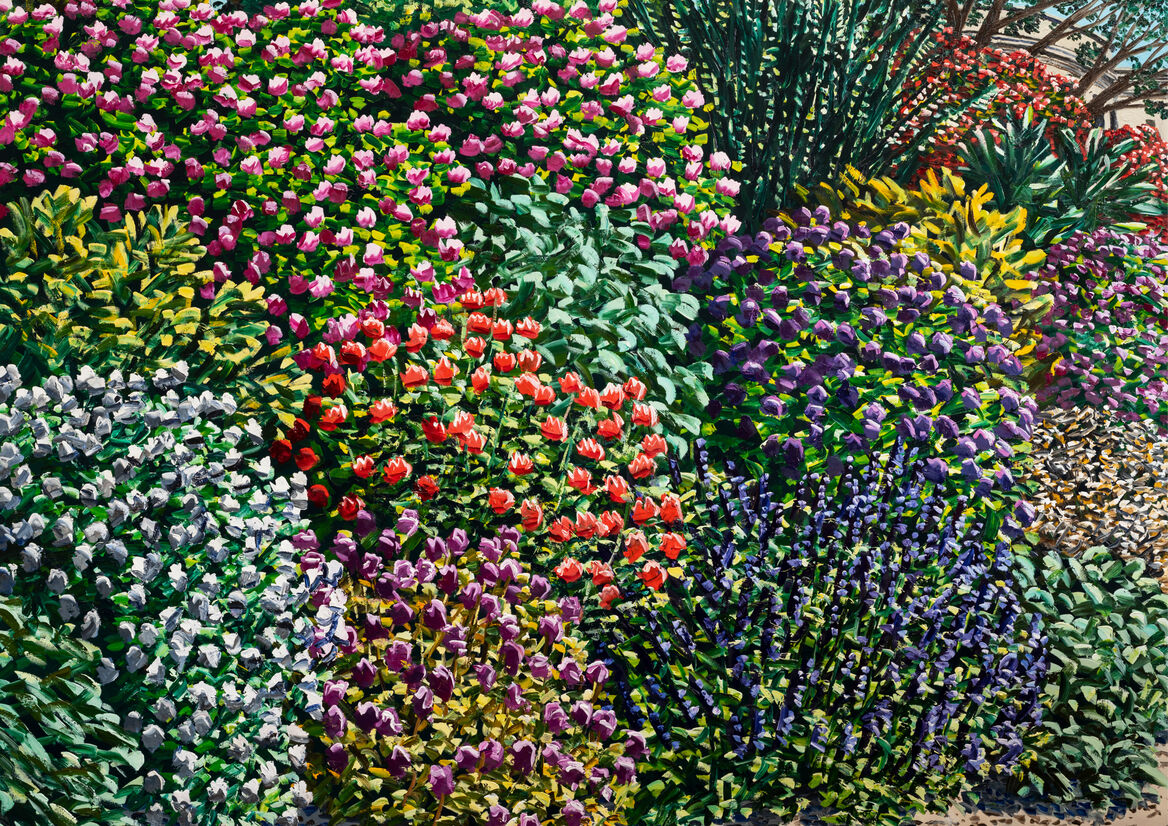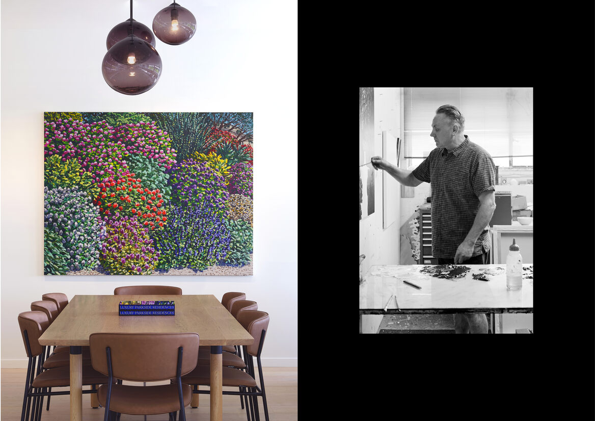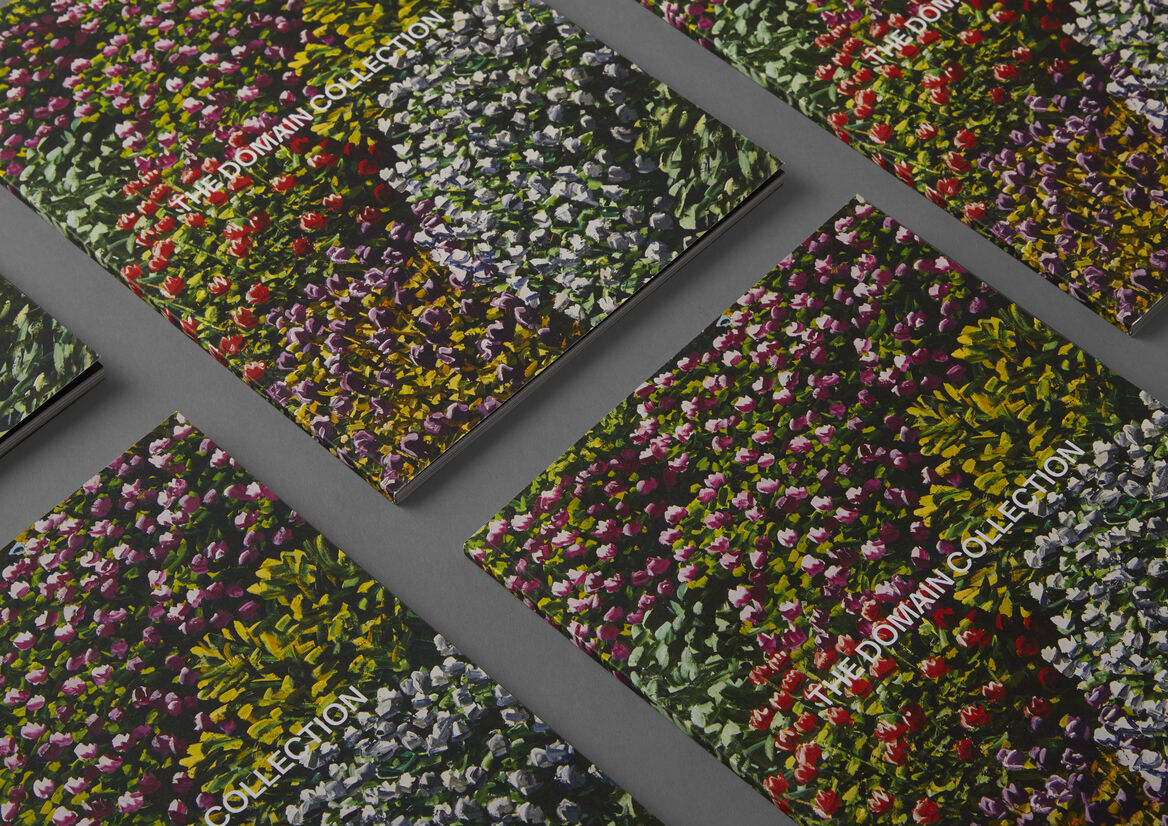 Karl Maughan is one of Aotearoa New Zealand’s most recognisable and well-collected artists. Maughan's work explores the cultural space of gardens, capturing their fantastical worlds through his exaggerated aesthetic. His use of colour and simplified compositions offer a contemporary take on one of paintings most traditional subjects. Domain, 2022 was commissioned especially for Domain Collection and repurposed across printed materials, signage, and the sales display suite.