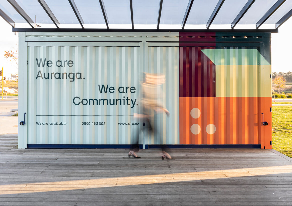The Auranga Centre is where the colour palette comes to life at large scale on the exterior of a 20FT container. The master brand pattern has been applied across three sides of the exterior, while the Sociology pattern has been used on the end facing the village square where it serves as a visual introduction to the pillars. The real world manifestation of the patterns gives new dimensions – both literally and figuratively – to the ARE brand, making the Auranga Centre a playful and welcoming gateway into this tight-knit community.