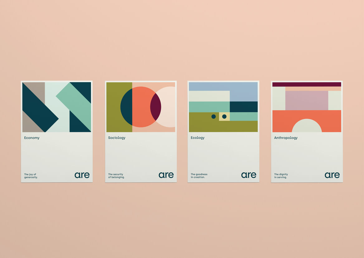 Carefully considered use of colour was crucial to help signal ARE as a disruptor in the market. An extensive palette is used across a master pattern and four sub-patterns, each of which represents a pillar: Economy, where opposing shapes represent a positive tension in coming together to transact; Sociology, where intersecting shapes represent communities forming something greater than the sum of its parts; Ecology, where horizontal layers represent the relationship of earth, sky and water; and Anthropology, where a bridge celebrates foundation and connection.
