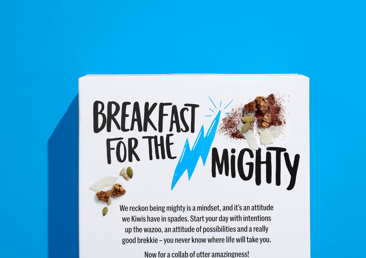 BeMighty captures the sentiment of the product - an energetic, inspirational and 'up-for-it' attitude. Packaging design language reflects this new optimistic outlook. Clean white packaging references the clean energy from LOW GI and fibre content. The fist pump (with breakfast spoon) is the universally understood visual for consumers to identify the products on shelf - upfront, proud and unapologetic. Typography is equally active and energetic, which is used across the prominent sales faces of the boxes. Back of pack copywriting celebrates the positive mindset of New Zealanders and inspiring them to get into their day.