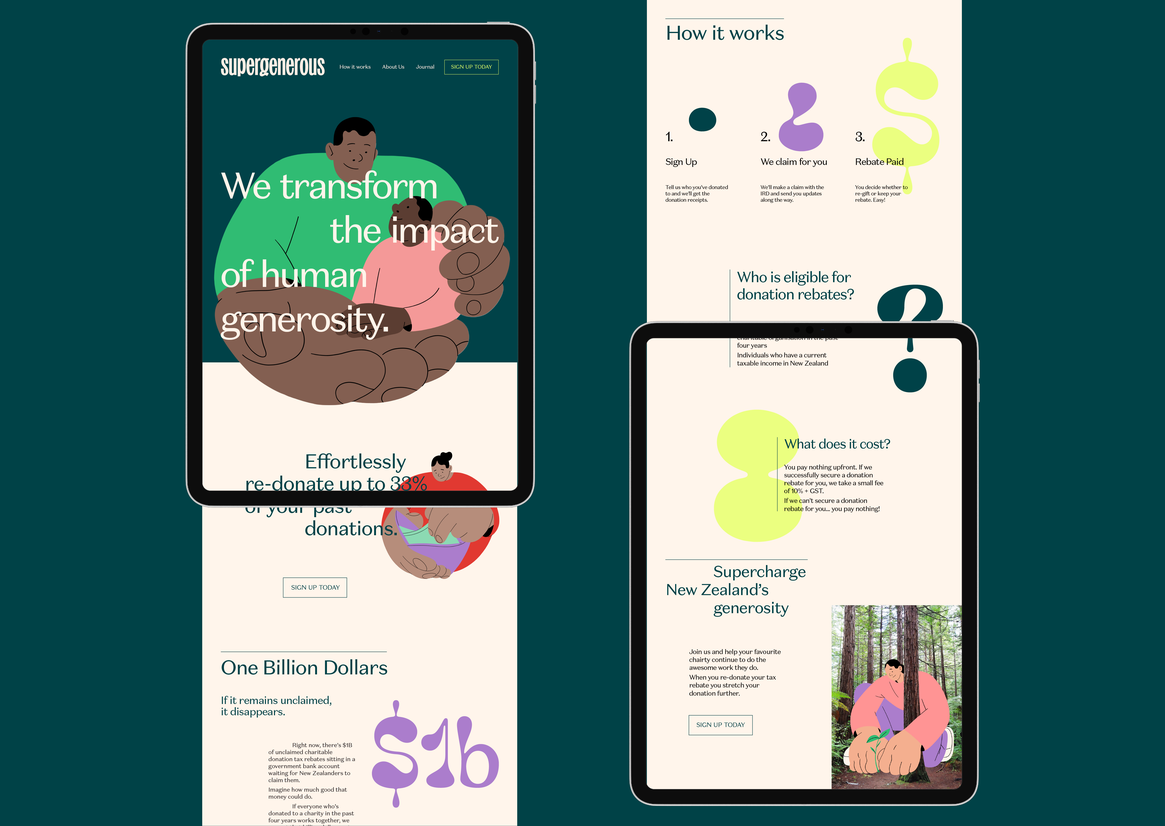 Colour became an important element in the creation of Supergenerous — the task was to evoke a strong sense of hope and optimism in the brand, while also being able to flex into a formal and legitimate tone. Donations will vary from anywhere between $10 to $1m — the goal was for the brand to be able to appeal to all donors.