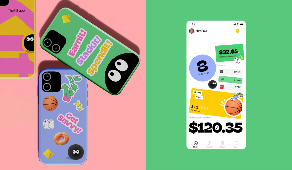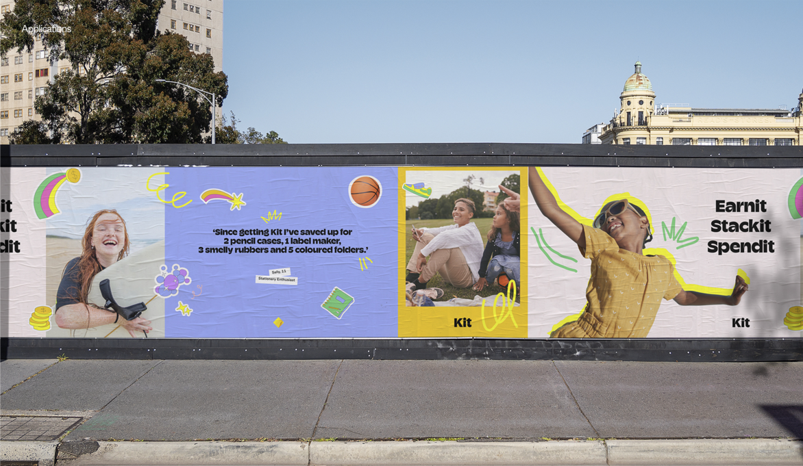 Working collaboratively with x15 and CommBank, we surveyed 5-16year olds to find out what they know and think about money. What we learned is that kids are motivated by what they want and what they want can be super random. In the same breath, they want Maxibons, a mansion, and to ‘make it rain’. Using the survey responses as a jumping off point, we developed the brand to be colourful, exuberant and quirky to ensure kids were excited to enter Kit’s universe. This led to our brand idea of ‘kids walking in a grown-up’s world’. The brand is equal parts playful and aspirational, ensuring kids want to keep coming back as they become more financially independent. Layering colour, illustration, photography and typography, we created a mixed-media visual language. The result emulates the idea of kids stepping into a grown-up’s world and appeals to the grown-up’s nostalgic sensibilities. The colour palette is bright and playful, created to make an impact and immerse the viewer into the vivid world of Kit. The hero character, Kit, was inspired by the tittle of the i, simple yet unified with the brand system. Cheerful and cheeky, Kit is the ultimate money sidekick for kids throughout their entire product experience. The Kit app does more than just make financial education fun –it enables kids and grown-ups to learn together. It’s designed to be simple, visual and customisable so kids can be independent and Earnit, Stackit, Spendit and most importantly, Learnit their way.