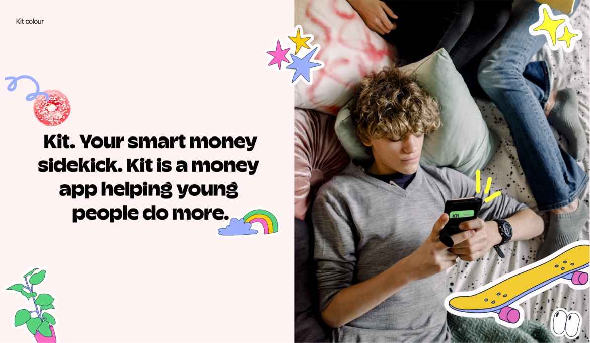 The brand is equal parts playful and aspirational, ensuring kids want to keep coming back as they become more financially independent. Layering colour, illustration, photography and typography, we created a mixed-media visual language. The result emulates the idea of kids stepping into a grown-up’s world and appeals to the grown-up’s nostalgic sensibilities. The colour palette is bright and playful, created to make an impact and immerse the viewer into the vivid world of Kit.