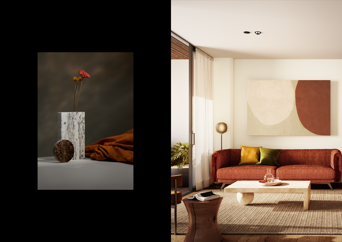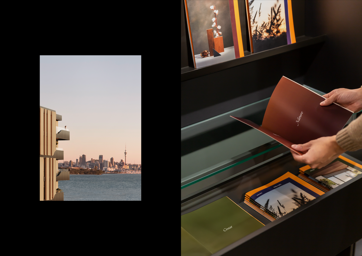 Colour informed not only the print collateral and digital outputs, but guided the furniture styling in the show suite, the colour grading of the lifestyle photography, the time of day the renders depict, and even the relaxed tone of voice used in the copywriting.