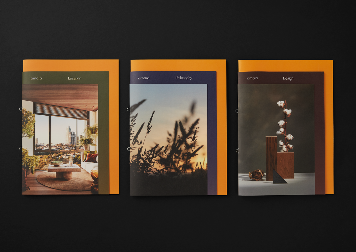 In the Amaia colours, we wanted to communicate the homely sense of warmth that was foundational in the design of the brand identity. The Amaia target audience — primarily young professionals — will likely work in the CBD, finding themselves at home before and after their commutes, at sunrise and sunset. Our colours were created to evoke the feeling of a new home, offering a glimpse of an idyllic future, and capturing quiet golden-hour moments by the sea.