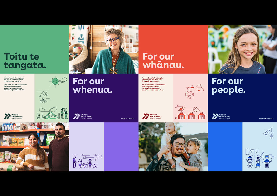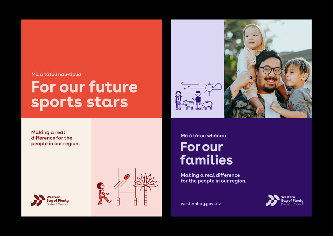 Colour was central to the new identity, not only adding vibrancy, but helping to differentiate between the various wards within the wider district. Each colour palette was chosen to best represent the people of each ward, with purple for the Kaimai sunset, blue for the Waihi ocean, and red for Te Puke pohutukawa. The result is a cohesive brand that is timeless and flexible, simple and engaging.