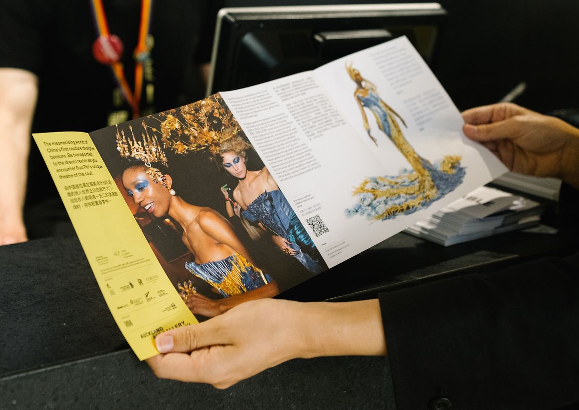 A limited palette of black and yellow was chosen for the exhibition identity due to its powerful visual impact and strategic symbolism. In Chinese culture, yellow is often considered the “forbidden colour” as it was traditionally reserved for royalty. By incorporating yellow, the exhibition reflected Guo Pei’s defiance of convention and her bold exploration of tradition and modernity in her couture creations.