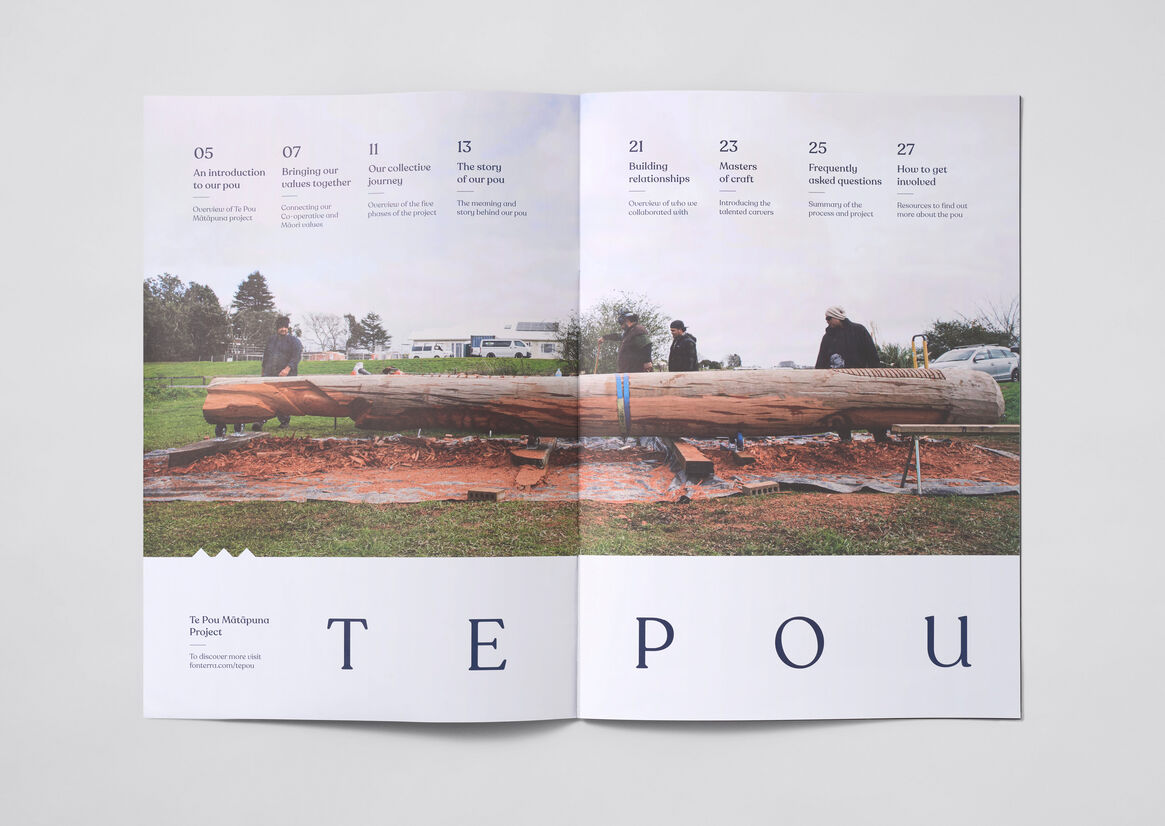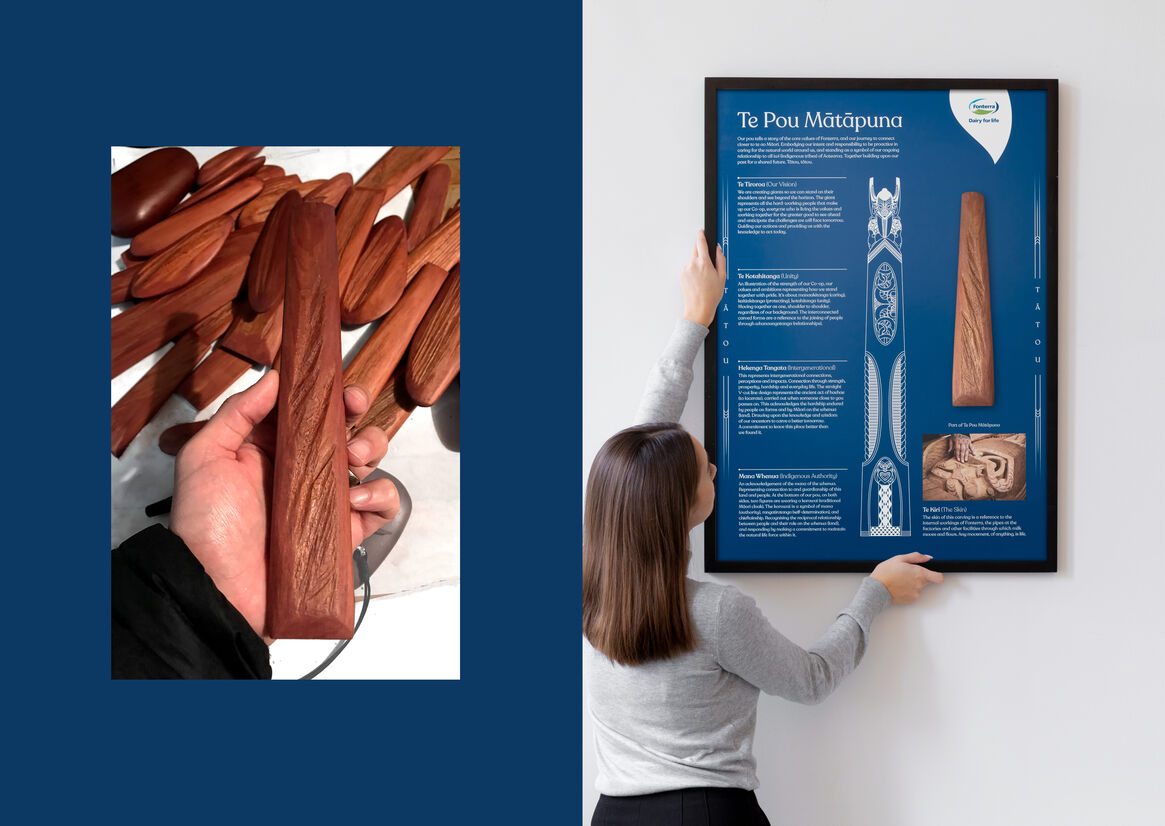 In order to share the creation journey and meaning behind the Pou and build as much engagement with its meaning and message as possible, we produced a comprehensive set of external and internal facing collateral. These included broadsheets, web pages, films, digital screens, banners, frames , posters, gifts [taonga] and the facilitation of an open day…