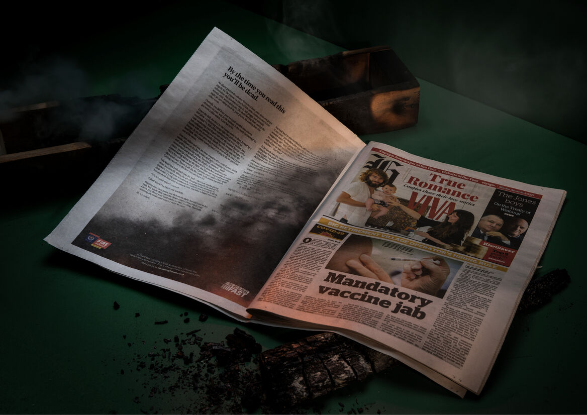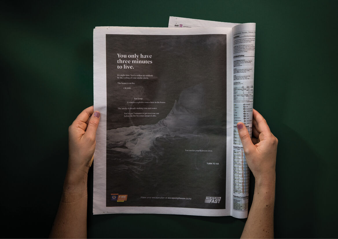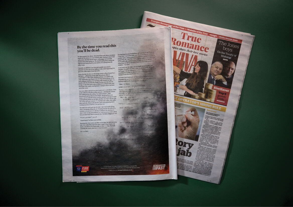 It’s harder to escape a house fire than people think. Because of toxic smoke, low visibility, encroaching flames – the disorientation is debilitating. To make this point, we created two narrative-driven ideas that utilised the unique format of the newspaper in different ways, ultimately driving home the same point – “Fire gets real fast.”