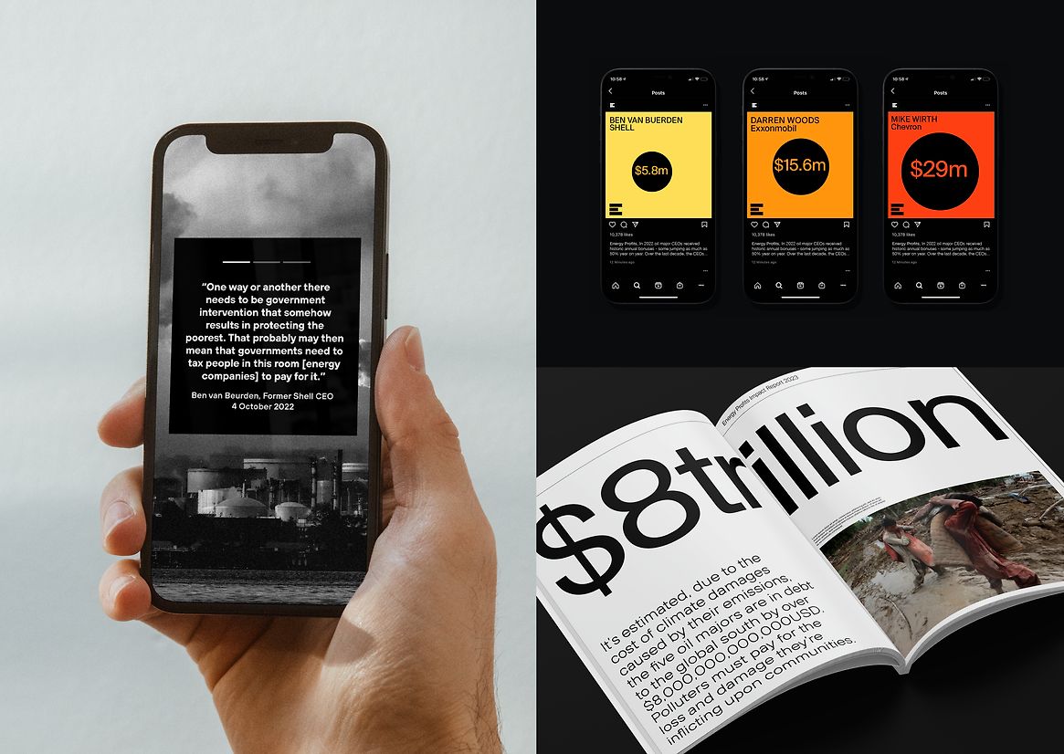 The key to the concept was bold data visualisation of the shocking statistics, using motion and animation to bring them to life and make them easy to digest. This translates across the entire brand including the logomark, with the ‘E’ icon representing growth in terms of profit, remuneration, emissions, and damage. The colour palette uses a combination of harsh black and white combined with the red, orange, and yellow hues to symbolise the planet heating up and the increasingly growing climate destruction. Combined with clean type and powerful photography, it makes for uncomfortable reading that's hard to ignore.