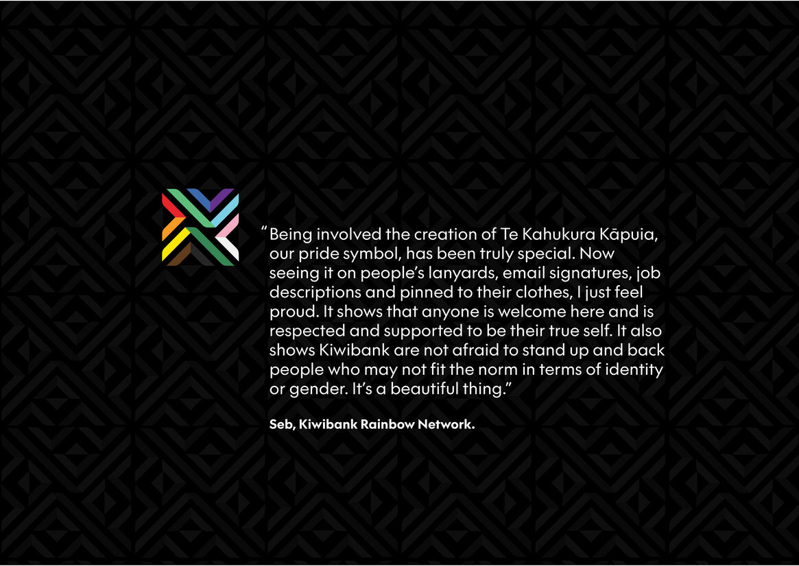 “Being involved the creation of Te Kahukura Kāpuia, our pride symbol, has been truly special. Now seeing it on people’s lanyards, email signatures, job descriptions and pinned to their clothes, I just feel proud. It shows that anyone is welcome here and is respected and supported to be their true self. It also shows Kiwibank are not afraid to stand up and back people who may not fit the norm in terms of identity or gender. It’s a beautiful thing.” Seb, Kiwibank Rainbow Network.