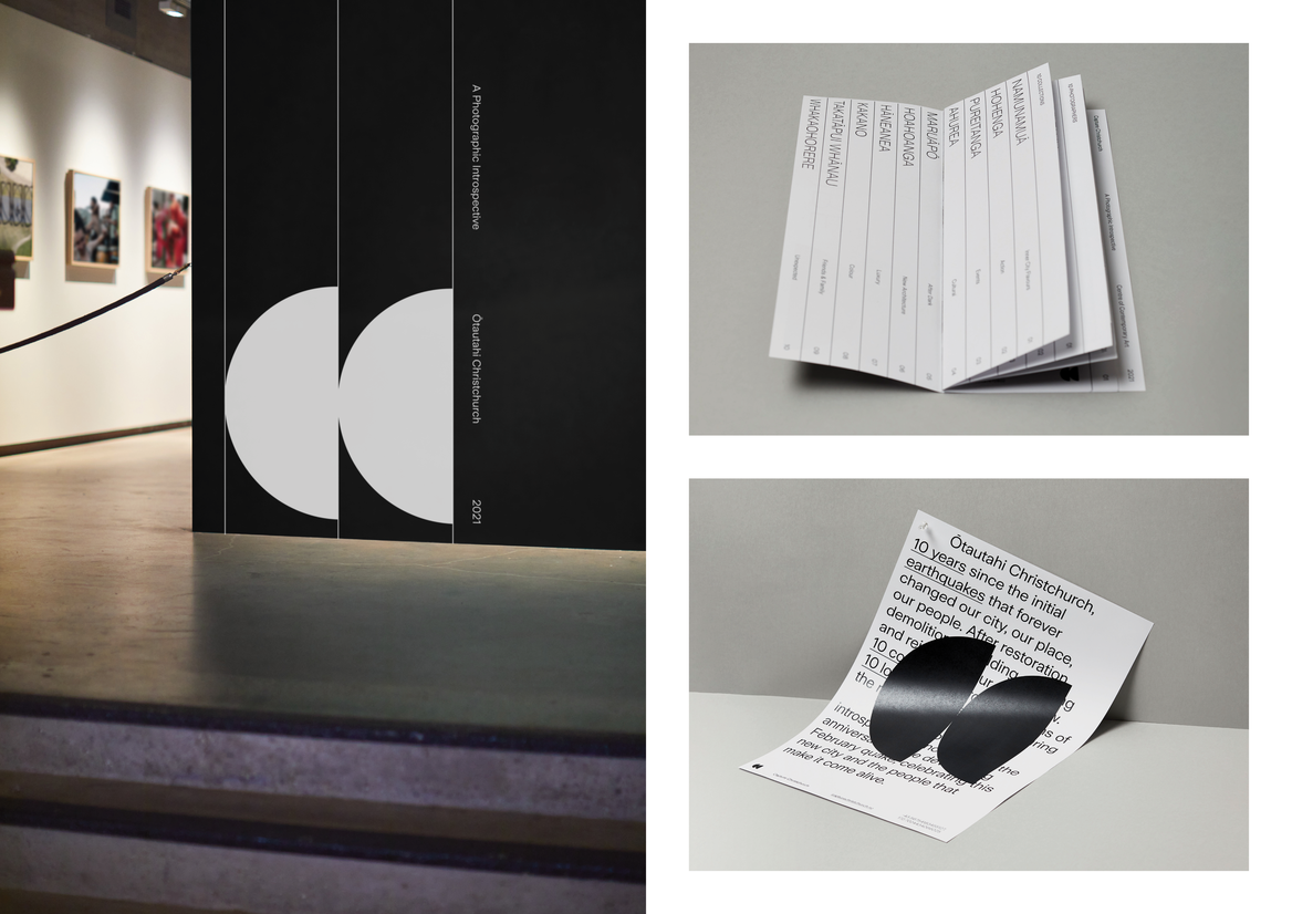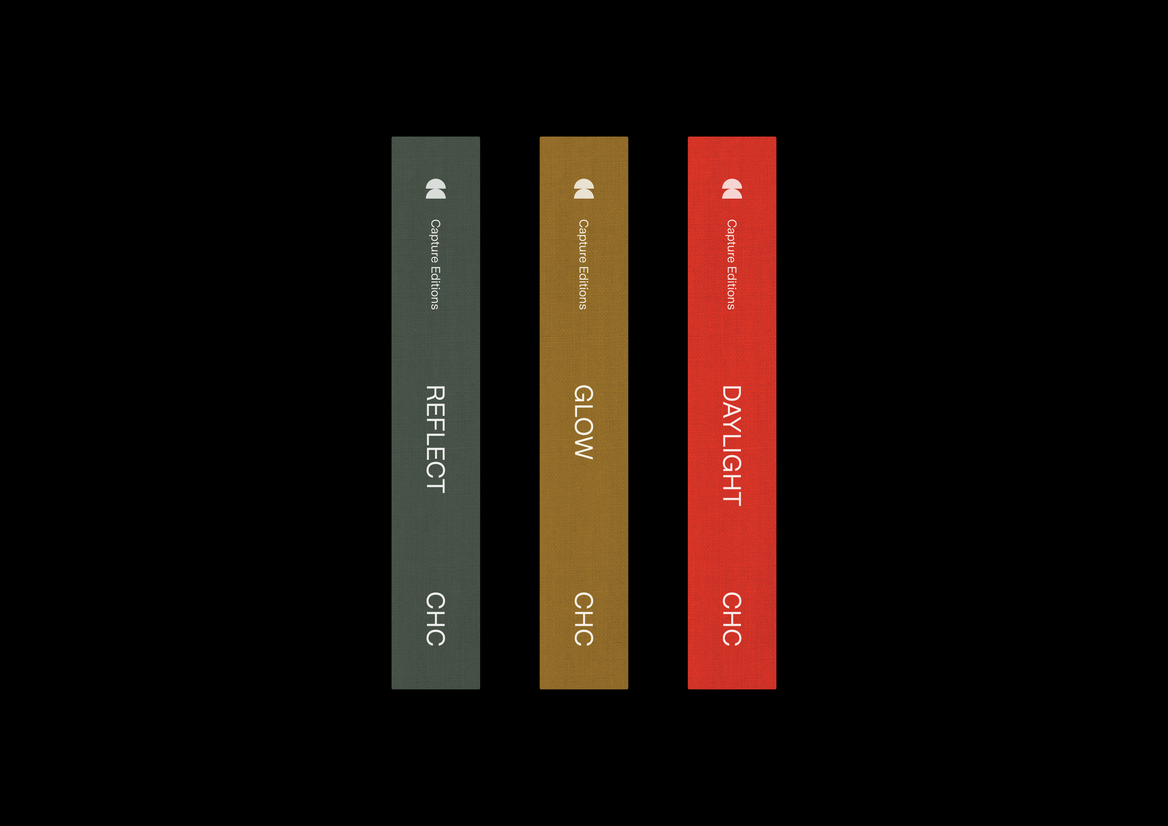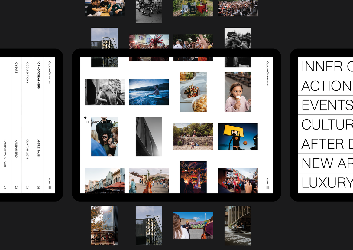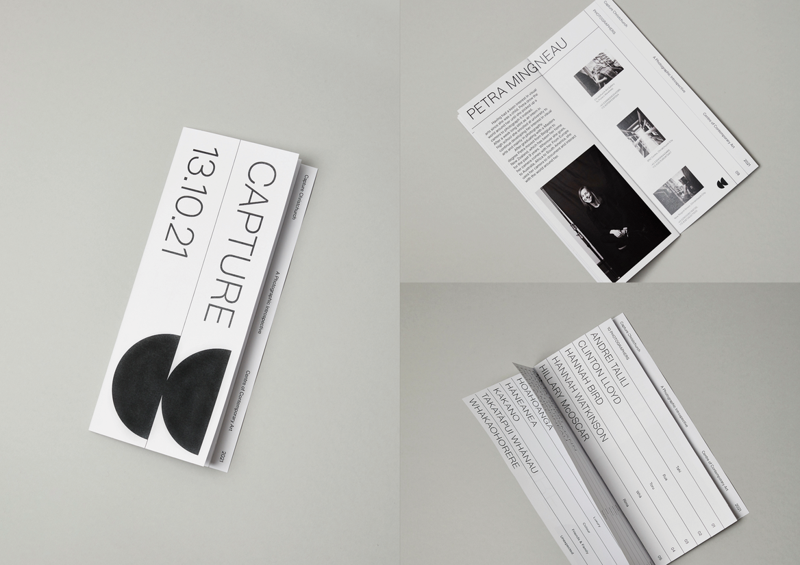 Various collateral was designed for promotion and distribution. An event invitation brochure echoes the structural elements of the identity in physical form, using staggered paper sizes to create a binder tab effect, organising each section. A small zine displays the photos in an easy to digest way, while the more in depth Capture Editions, a volume of coffee table books, forms the beginning of a future documentation of Christchurch, categorised and numbered and linen bound.