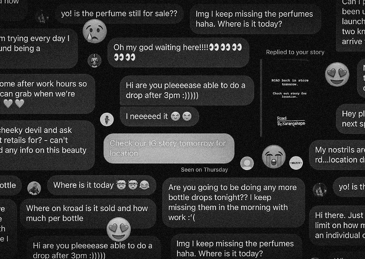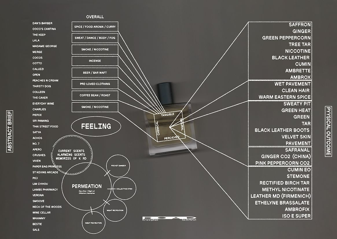 Wet pavement, pre-loved garment musk, green heat and fresh dancefloor perspiration were some of the key scents sniffed out to become the base notes of ROAD.