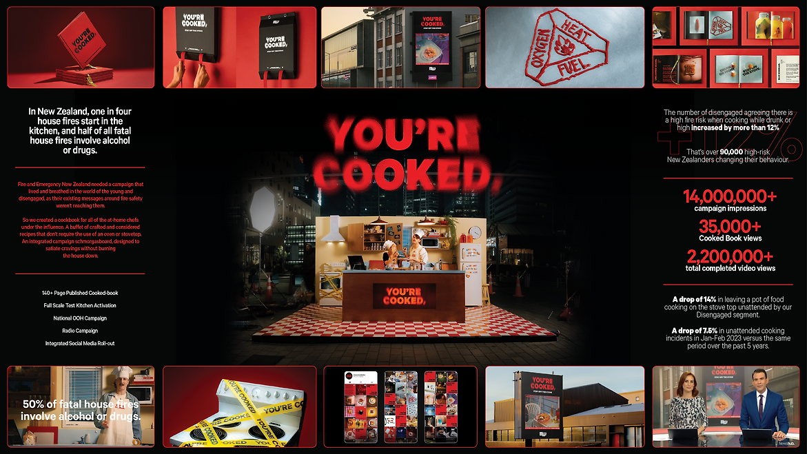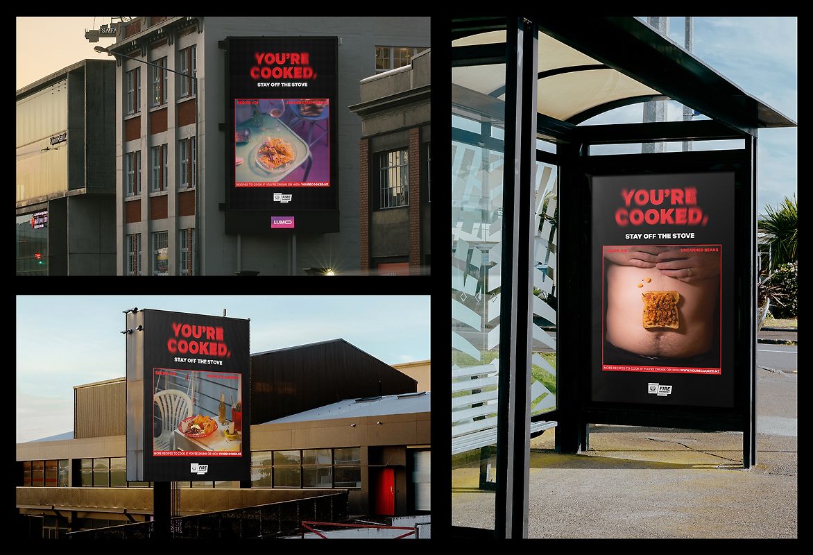 ‘You’re Cooked’ needed to live in the world of the young and 'disengaged'. An uninhibited reality, where drunk and hungry people WILL eat. So our communications and visual language leant into this world of amateur chefs under the influence. Instead of hard-hitting scare tactics, we used humour and realism to make fire safety fun and enjoyable, while sharing skills to prevent fires from happening in the future.