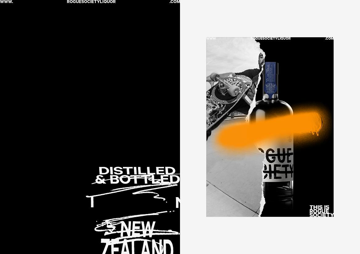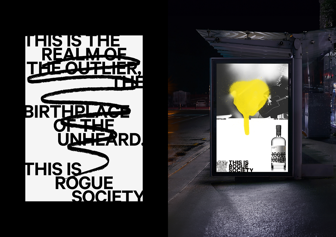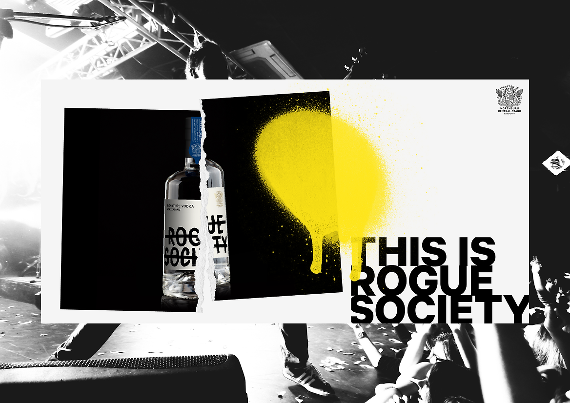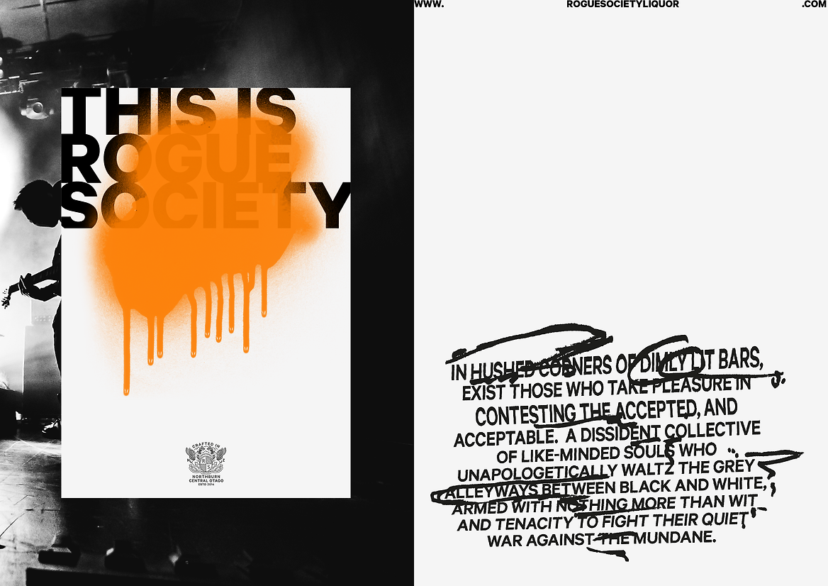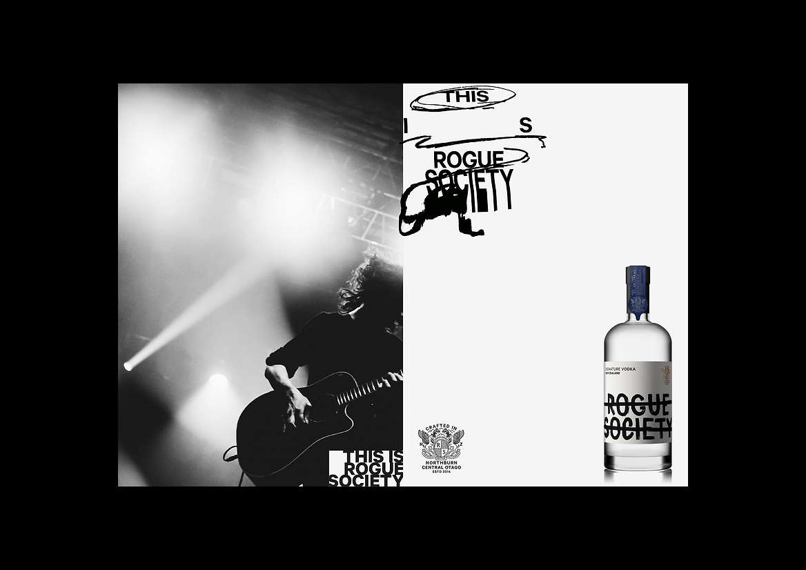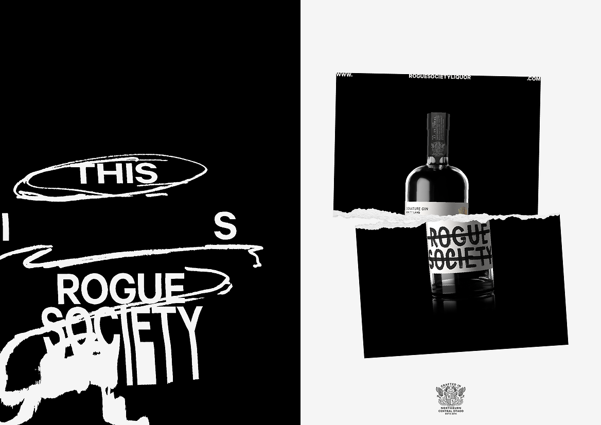 A new Rogue Society crest was created to elevate the premiumness and draw more attention to its New Zealand origins. The traditional, prestige connotations of a crest were subverted however: by cropping, distressing and otherwise mistreating it throughout the visual materials, we made it clear that this was no old or stuffy brand.